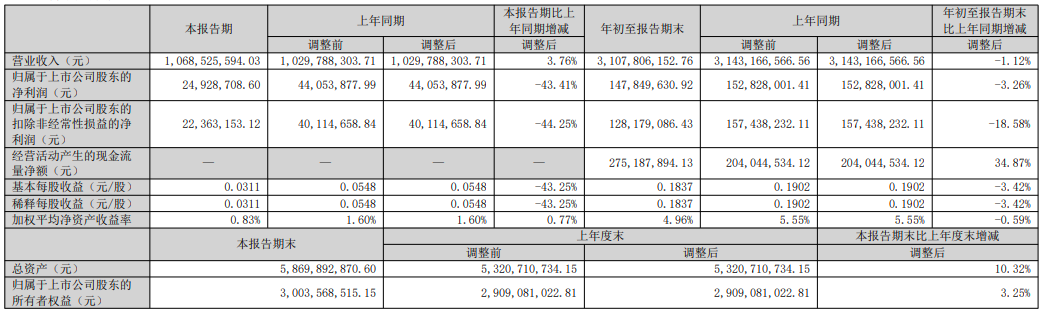 2024年年报显示,公司营收净利双降,其中,营业总收入43.22亿元,较上年同期减少5.84%;归属于上市公司股东的净利润 2.87 亿元,较上年同期减少 22.81%。