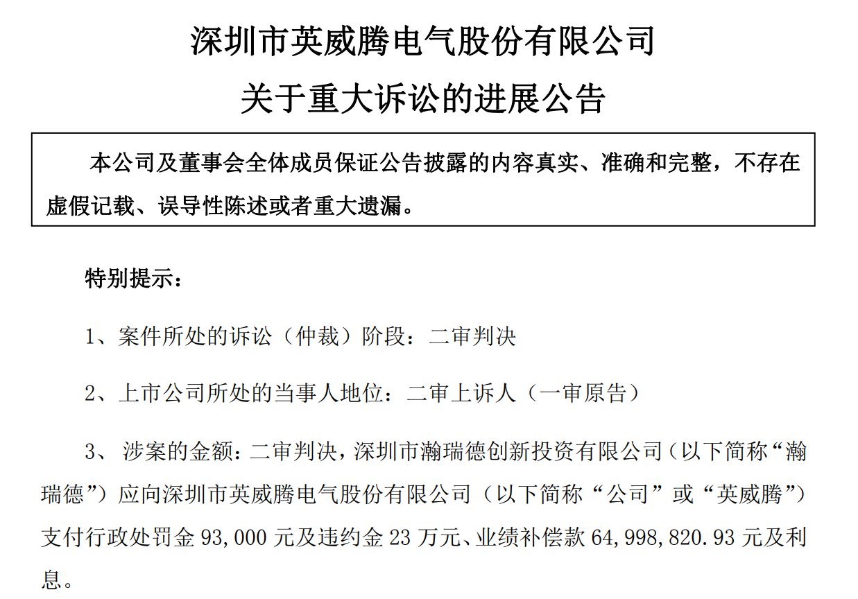 此案件经多次移送和立案后,2022年9月,英威腾公告称,深圳市中级人民法院作出判决:被告瀚瑞德公司应于判决生效之日起十日内,向英威腾支付违约金23万元及行政处罚9.3万元,英威腾要求被告支付3亿余元业绩补偿款的请求被驳回。