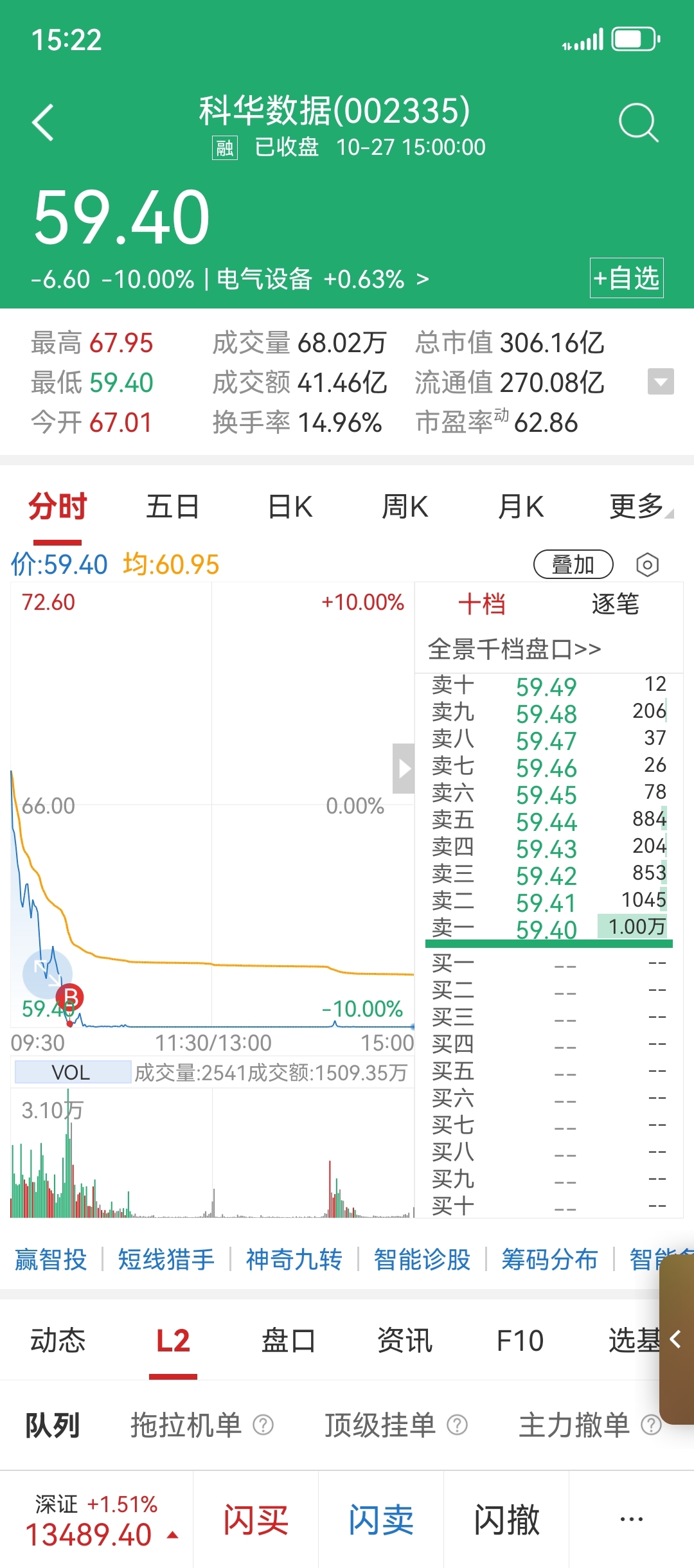 $科华数据(SZ002335)$ 早上跌停时抢进的,现在头昏的很。!