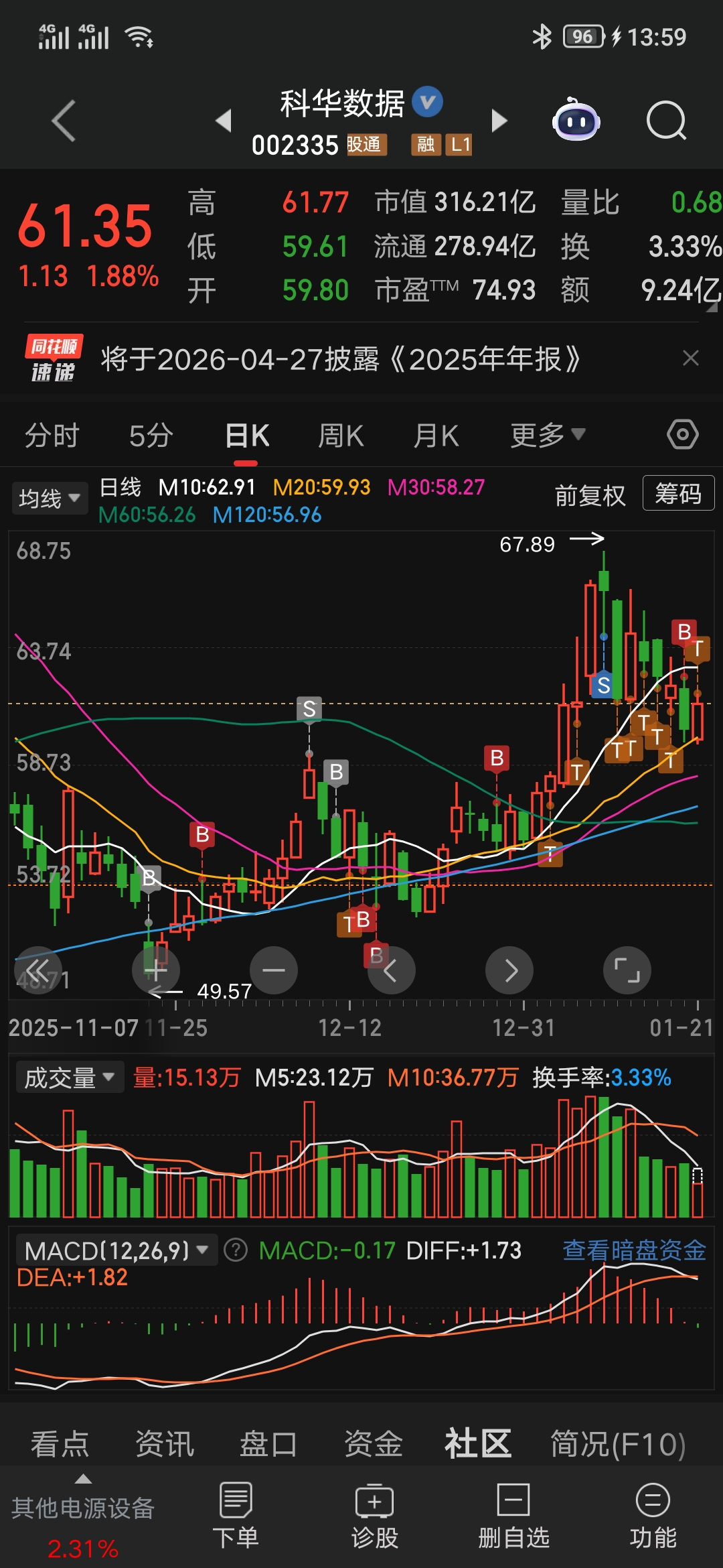$科华数据(SZ002335)$ 昨天亏大了,抄底也抄在半山腰,还好今天高位出掉,低位又接了回来,第二次进来的成本已经降到50以下了,结合第一次的成本应该在45以下