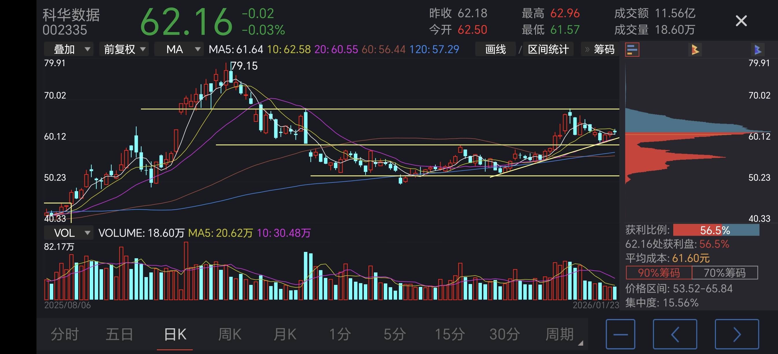 $科华数据(SZ002335)$ 慢慢磨了,67元上方有以前的密集成交区,62元上方有最近密集成交区,主要还是和前高时间太短(至少6个月),套牢盘化解难,底部上涨13天,回调7天,会不会又在这个60.5和67.5箱体震荡?谁知道呢?