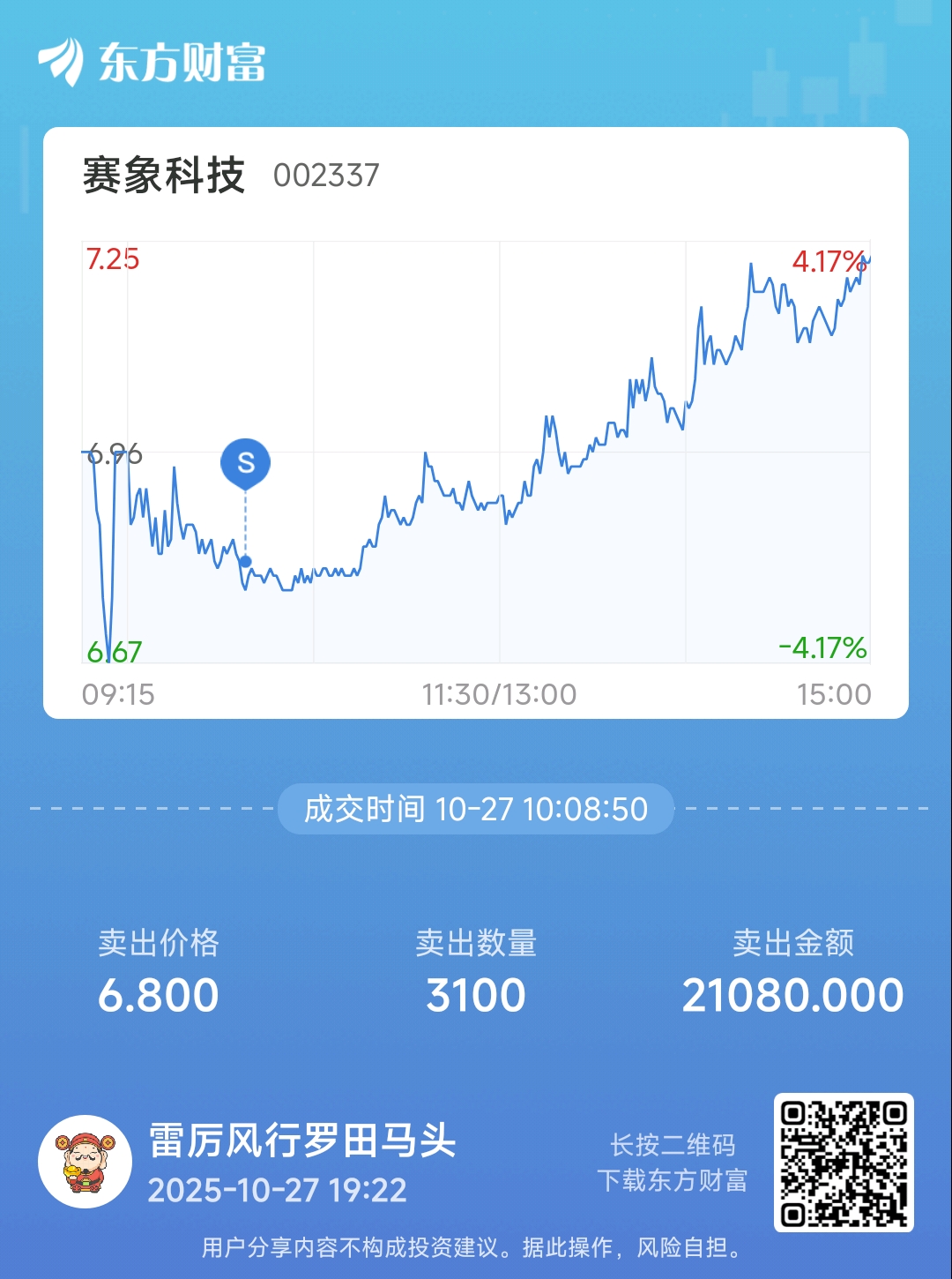 温馨提示: 1.根据《证券法》规定,禁止编造、传播虚假信息或者误导性信息,扰乱证券市场;2.用户在本社区发表的所有资料、言论等仅代表个人观点,与本网站立场无关,不对您构成任何投资建议。用户应基于自己的独立判断,自行决定证券投资并承担相应风险。《东方财富社区管理规定》