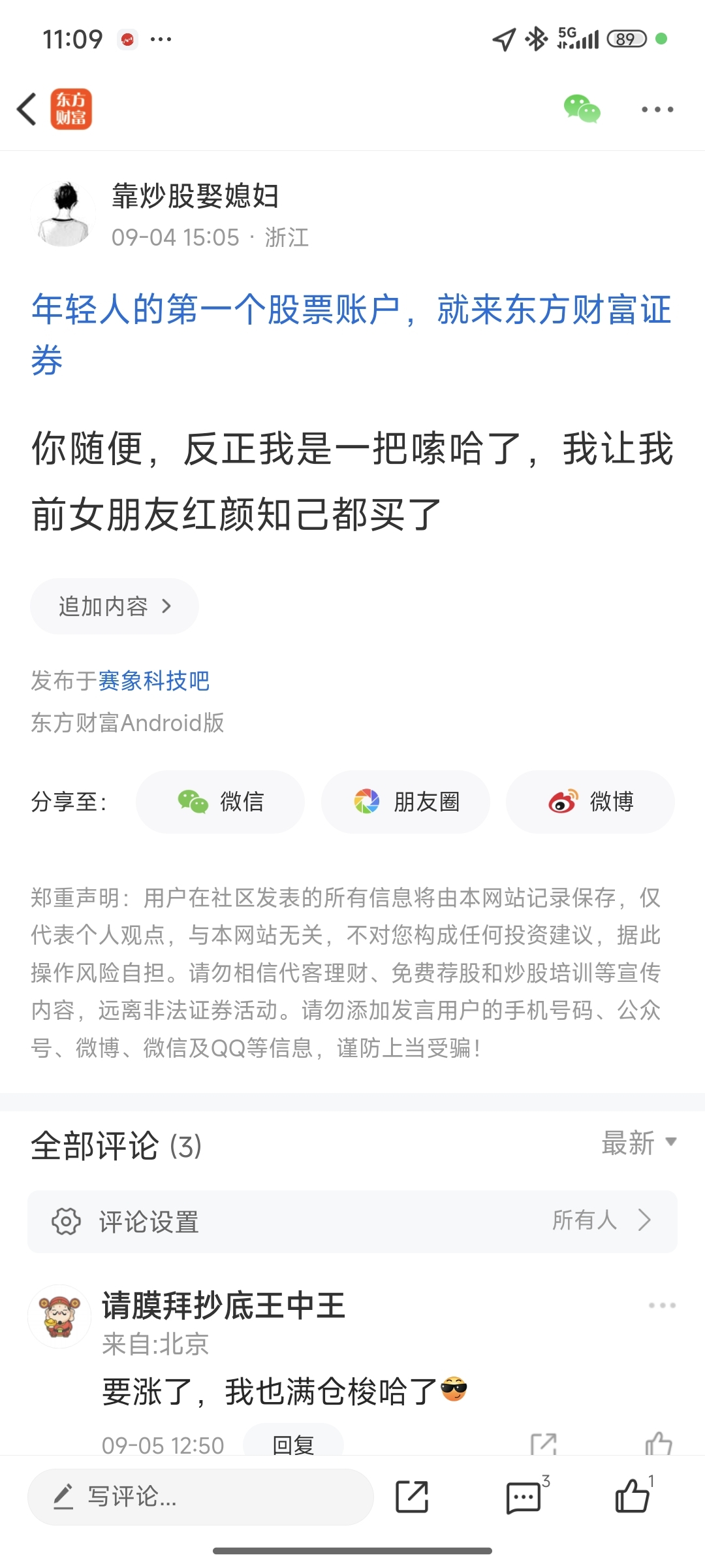 温馨提示: 1.根据《证券法》规定,禁止编造、传播虚假信息或者误导性信息,扰乱证券市场;2.用户在本社区发表的所有资料、言论等仅代表个人观点,与本网站立场无关,不对您构成任何投资建议。用户应基于自己的独立判断,自行决定证券投资并承担相应风险。《东方财富社区管理规定》