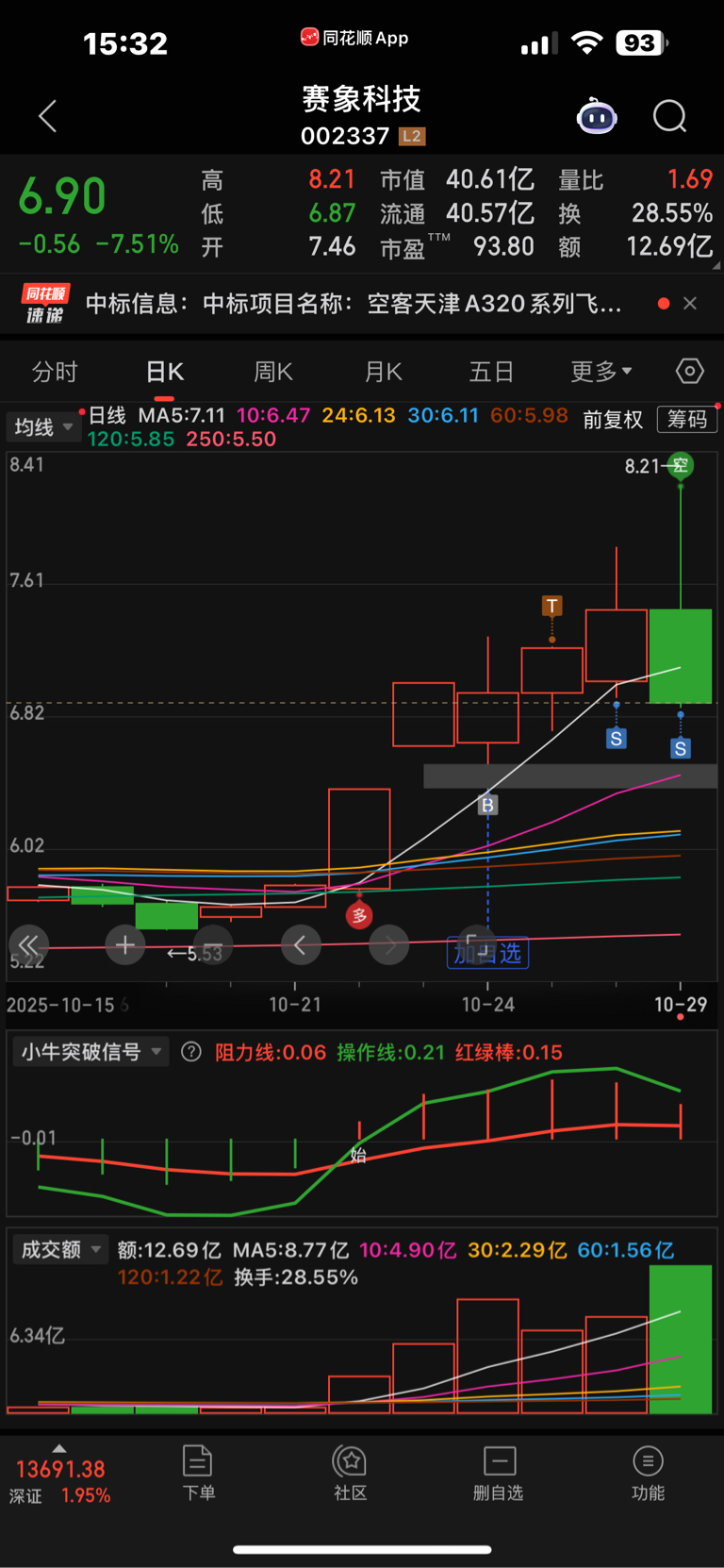 $赛象科技(SZ002337)$ 周五6.85的成本,中途操作失误两次,昨天水下减仓,今天2个点跑完,今天始终觉得技术指标高了要调整,当时分时背离了,2个就跑了,中途还郁闷了很久,现在看整体赚了6个点也该满足了