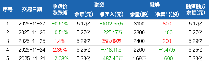 奥普光电:融资净偿还1012.55万元,融资余额5.17亿元(11-27)