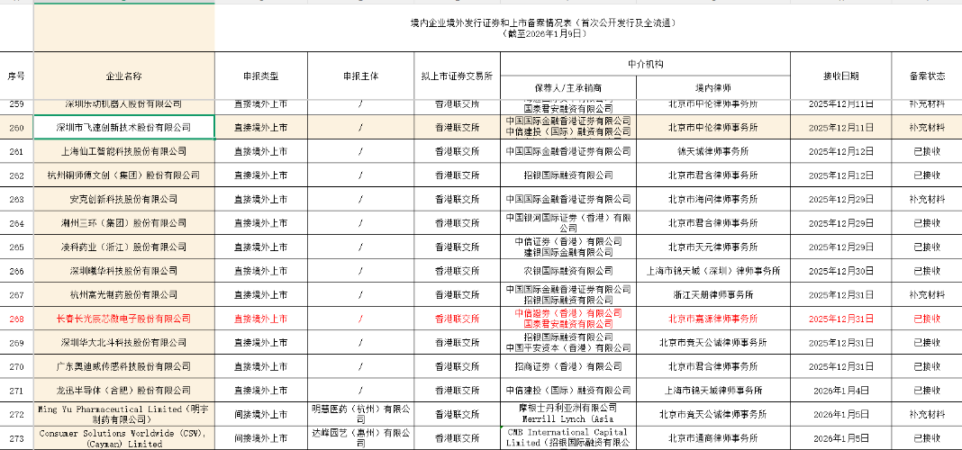 证监会官网上长春长光辰芯境外上市备案申请状态更新为“已接收”