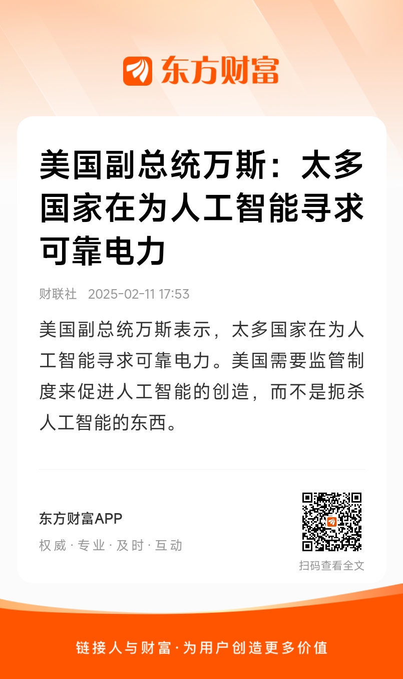 美国副总统万斯表示,太多国家在为人工智能寻求可靠电力。美国需要监管制度来促进人工智能的创造,而不是扼杀人工智能的东西。