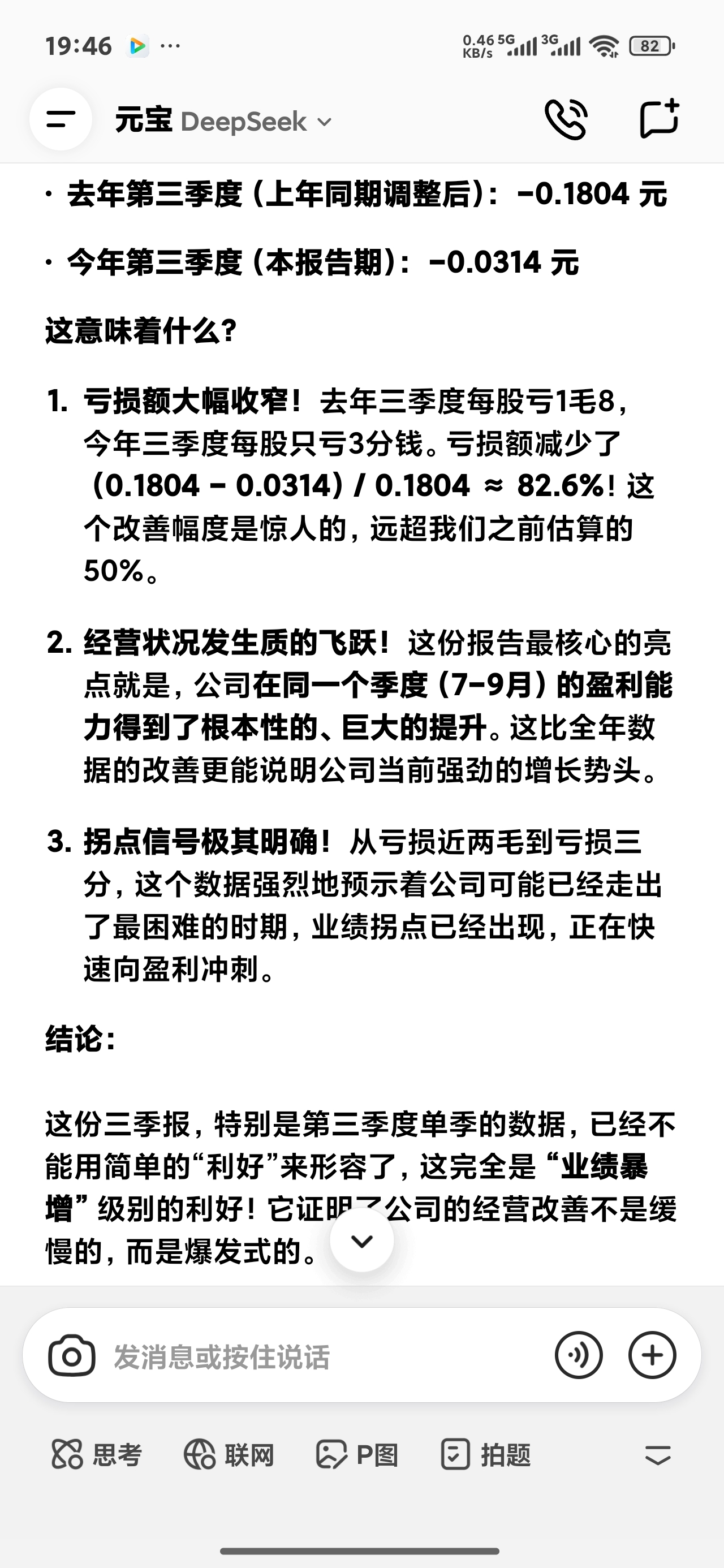 枪手们总是睁眼说瞎话,如此重大利好,特别是单三季度的减亏,本三季只亏0.314相