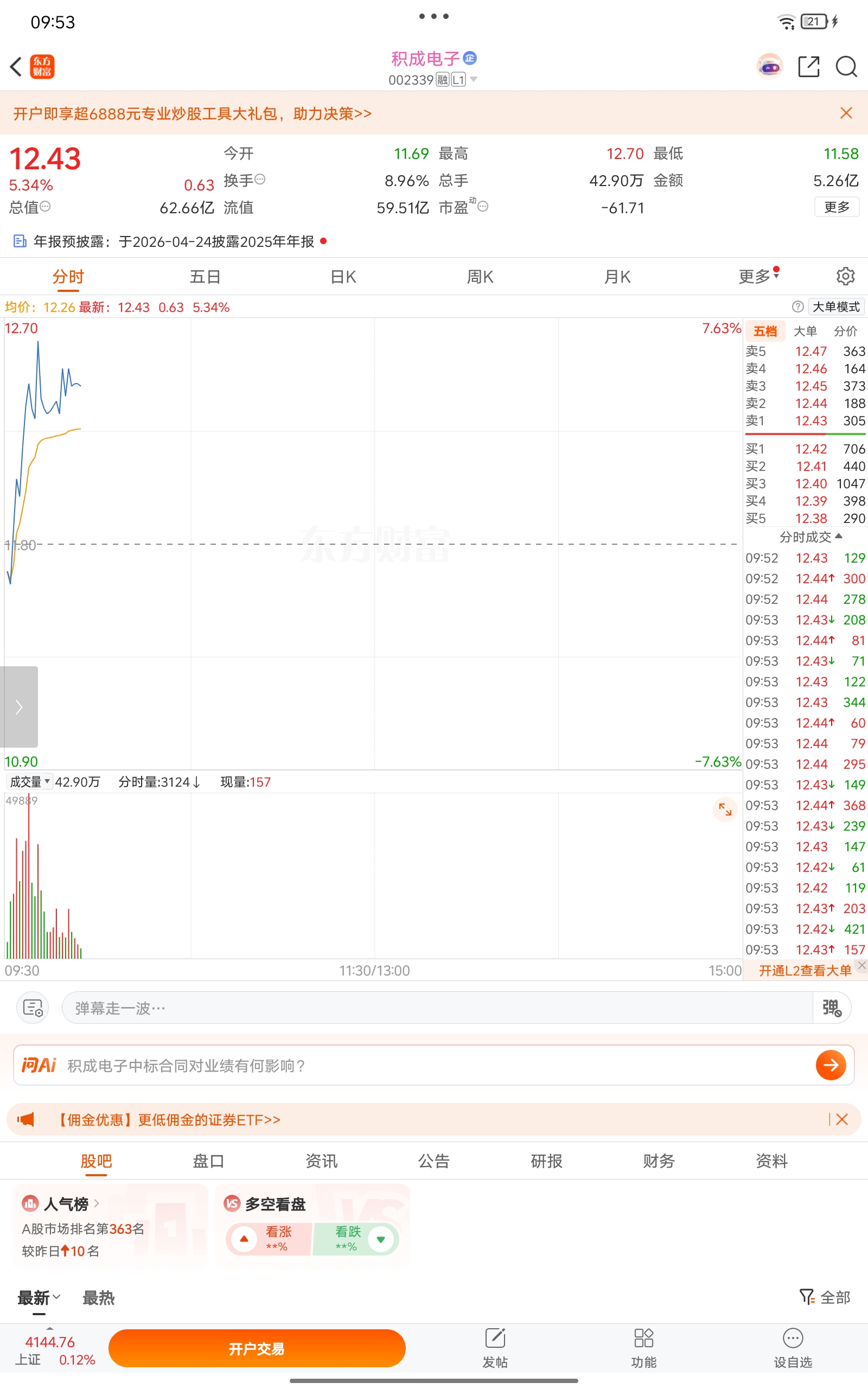 $积成电子(SZ002339)$ 11附近上车积成的朋友,可以先落袋一部分,到手的肉先吃!不要管别人怎么说,走自己的路!稳中求胜!
