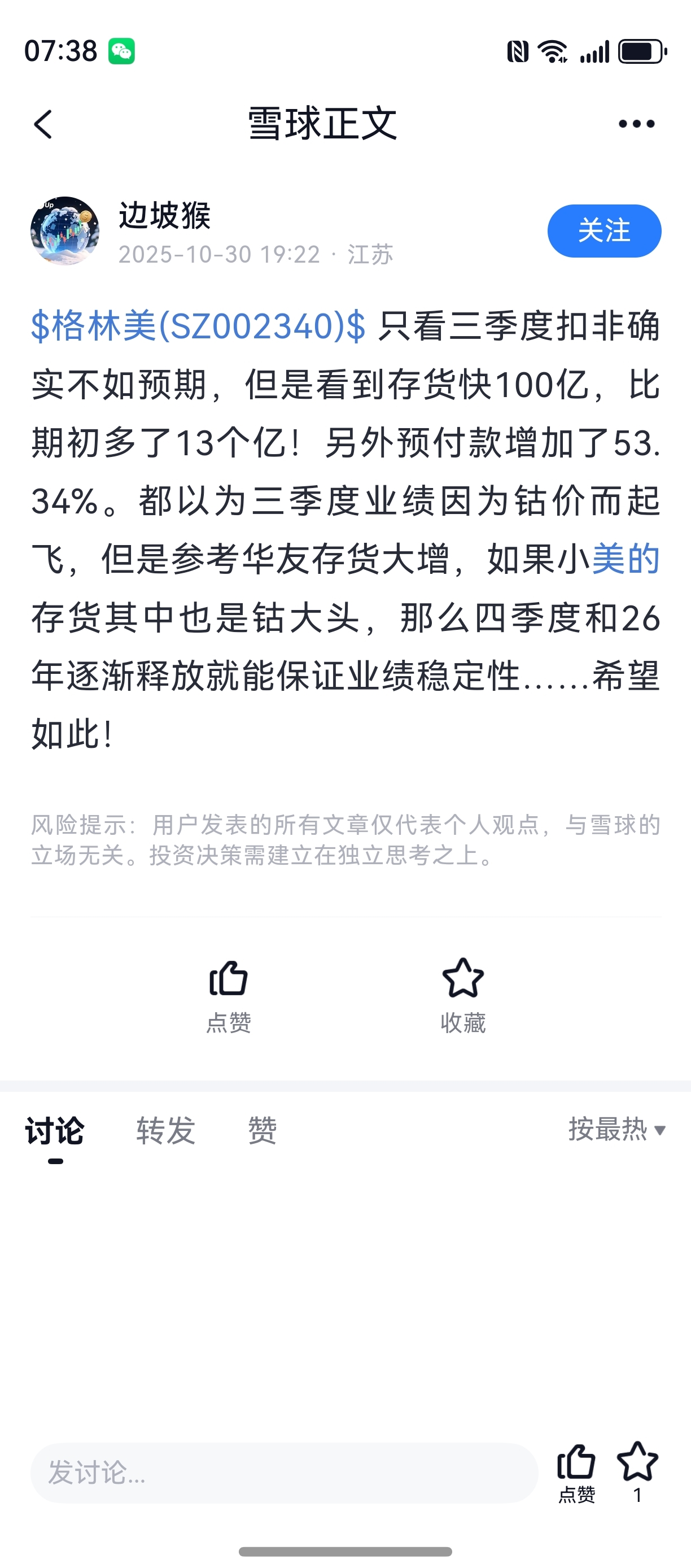 只看三季度扣非确实不如预期,但是看到存货快100亿,比期初多了13个亿!另外预付