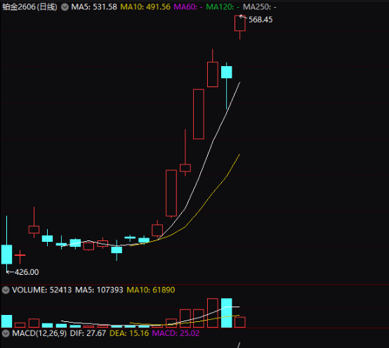 另一贵金属——铂的期货价格也大涨。12月22日,广期所铂期货主力合约也以涨停价收盘,收盘涨幅达6.99%,报568.45元/克,创出广期所铂期货品种上市以来新高。今年12月以来,广期所铂期货主力合约累计涨幅已高达30.86%。