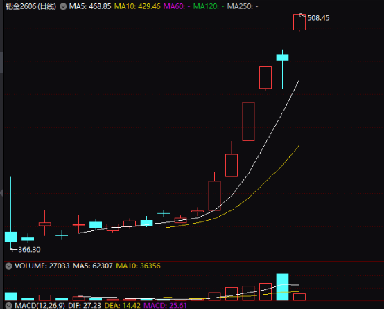 行情数据显示,当天广期所钯期货主力合约以涨停收盘,报508.45元/克,创出广期所钯期货品种上市以来新高,收盘涨幅达7%。今年12月以来,广期所钯期货主力合约累计涨幅已高达36.22%。