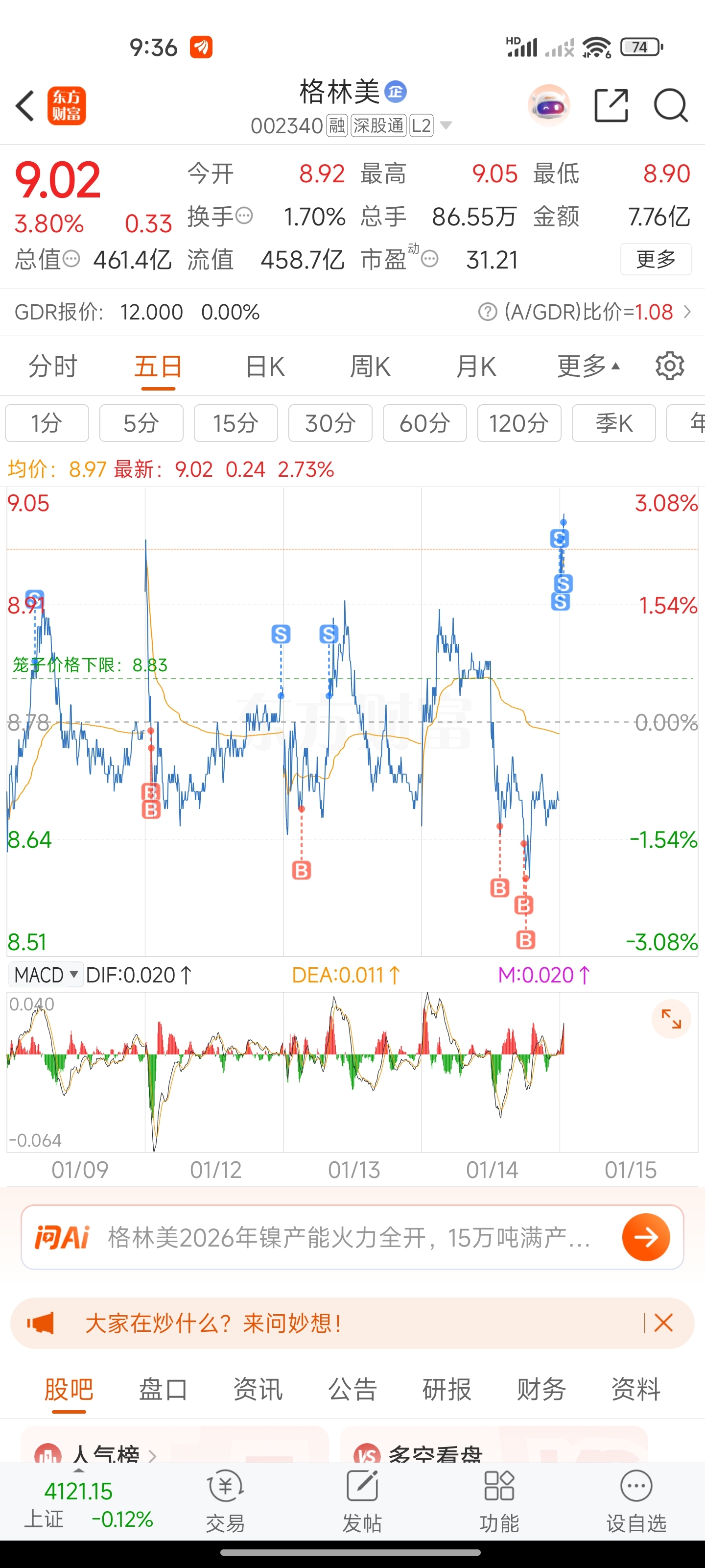 $格林美(SZ002340)$ 我不知道后续怎么样,我只知道,我终于解套了,高价9.38卖入的,做了一星期的T了,你知道我这一星期是怎么过来的吗?从28000股,我就留了800股,我回本了,要是还涨我就意思一下,注定和我无缘,要是下跌我800股也赔不了多少!