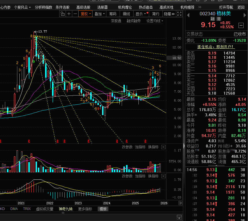 为什么一直不涨?看月K线的江恩角度线就知道了。不过看样子一周内将突破上行。