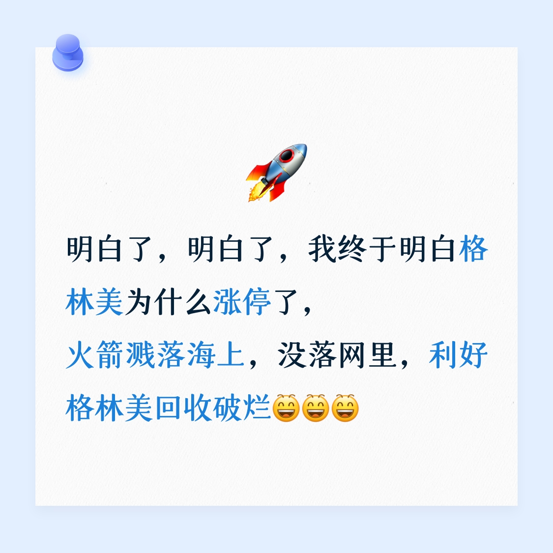 明白了,明白了,我终于明白格林美为什么涨停了,火箭溅落海上,没落网里,利好格林美