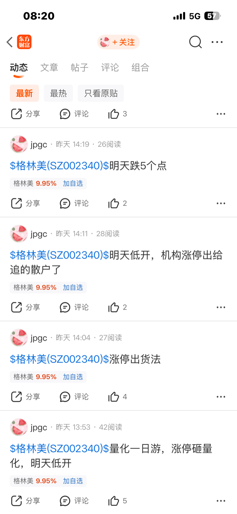 $格林美(SZ002340)$ jpgc这条枸只要出来唱多就跌,唱空就会涨,屡试不爽,你们看看他发的任何股票都是这样的,完美反指,真扫把形,我不知道家里人是不是都被他妨没了