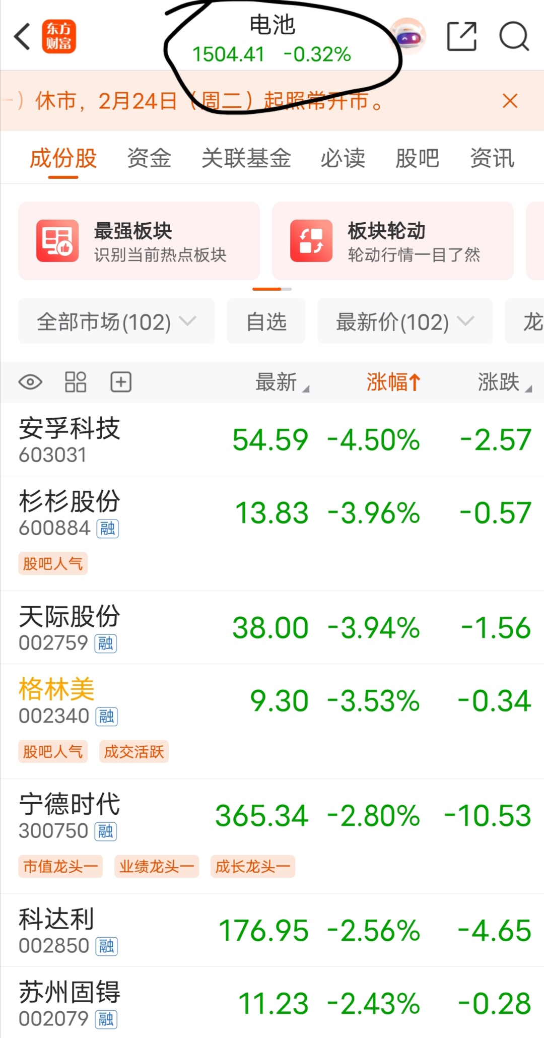 昨天还是能源金属板块,一共13家,现在剩12家了,电池板块102家,阿美摇身一变