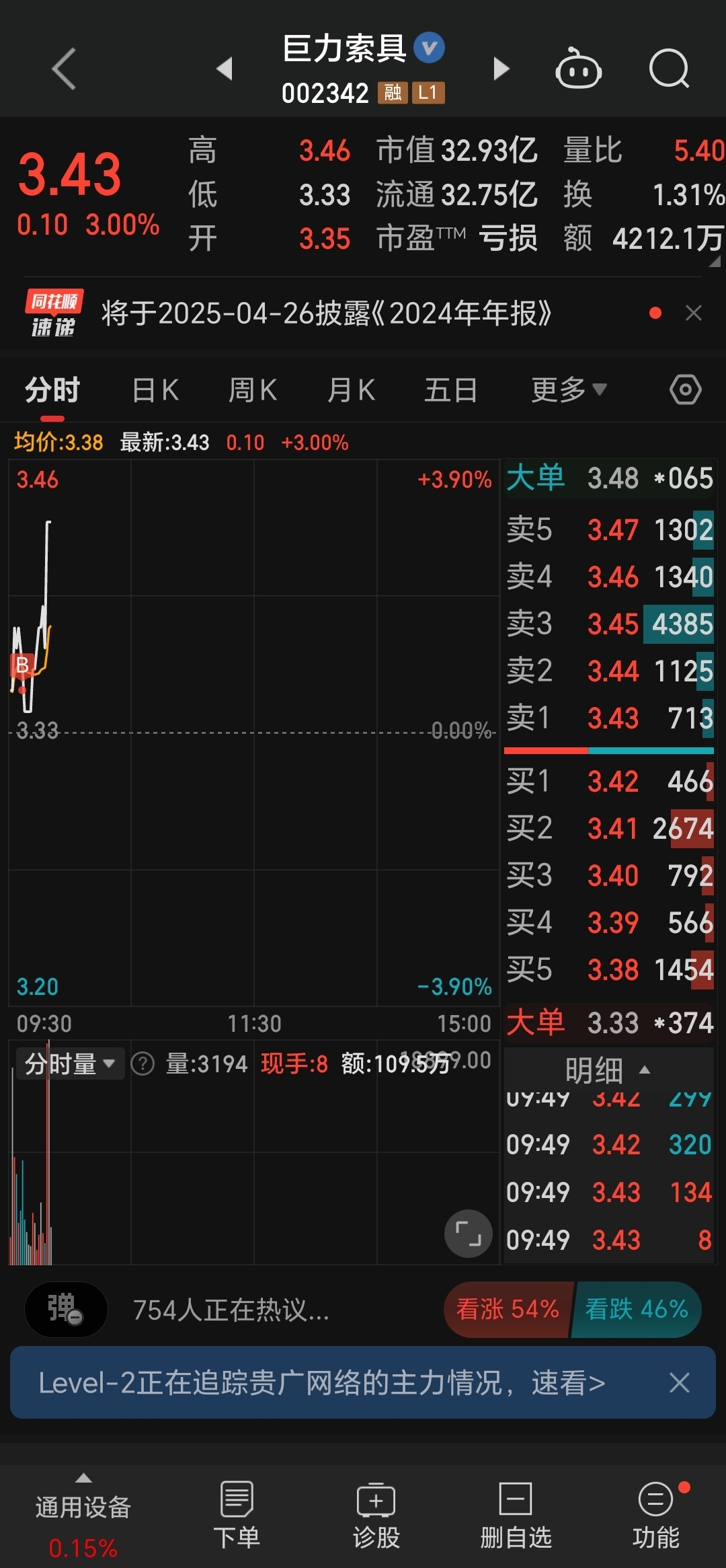$巨力索具(SZ002342)$ 哈哈,3.35进了巨力!
