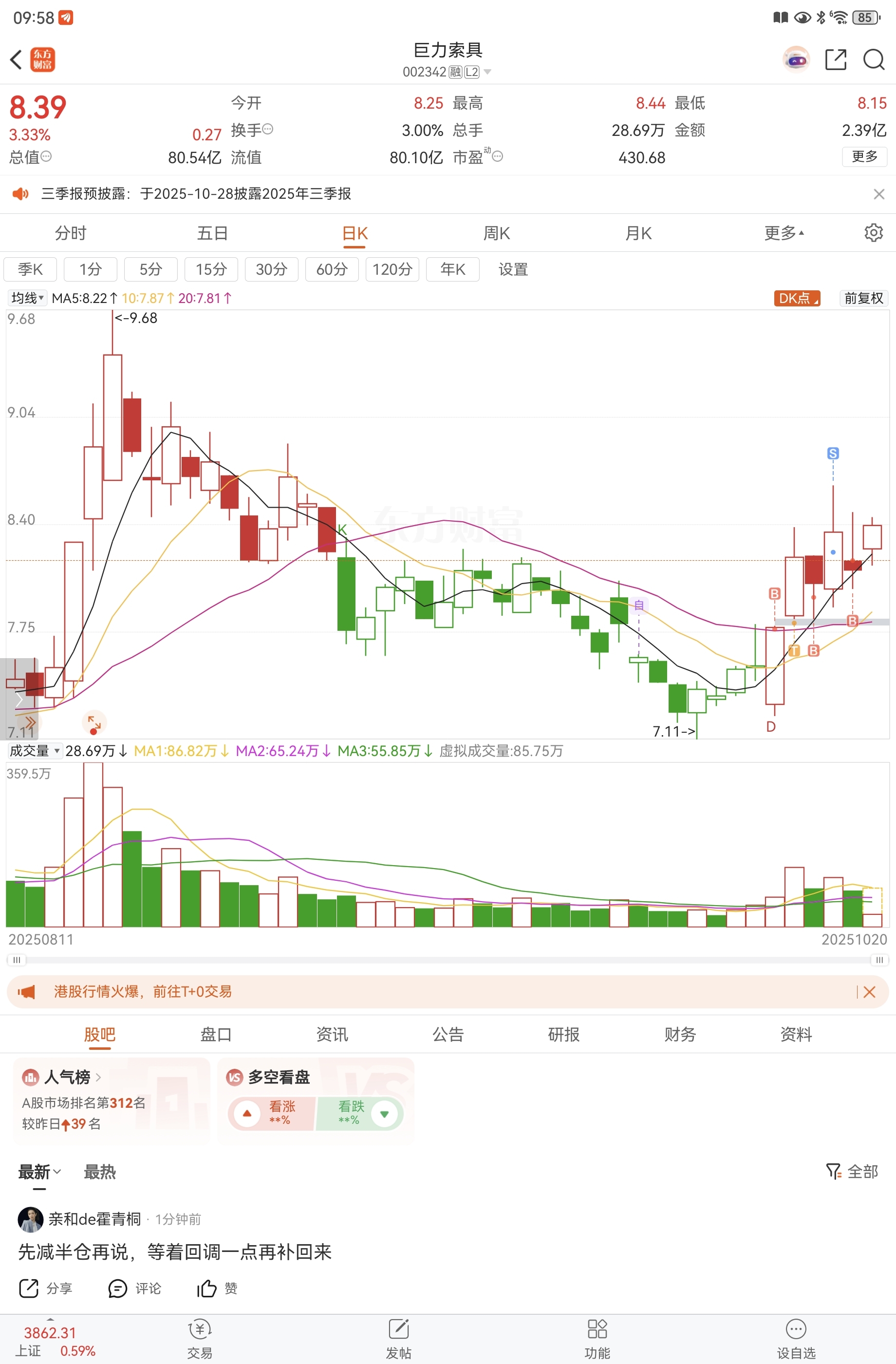 $巨力索具(SZ002342)$ 不仅唱多,还做多,今天表现的很强劲(jng),适时加仓。