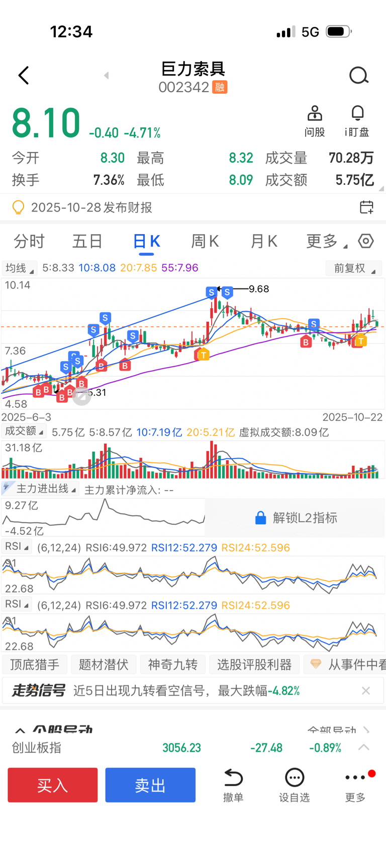 $巨力索具(SZ002342)$ 大概率这次还要去摸周线五日线今天不修复,小赚走人,这次不贪也是盈利2个,炒股没有后悔药,执行自身纪律