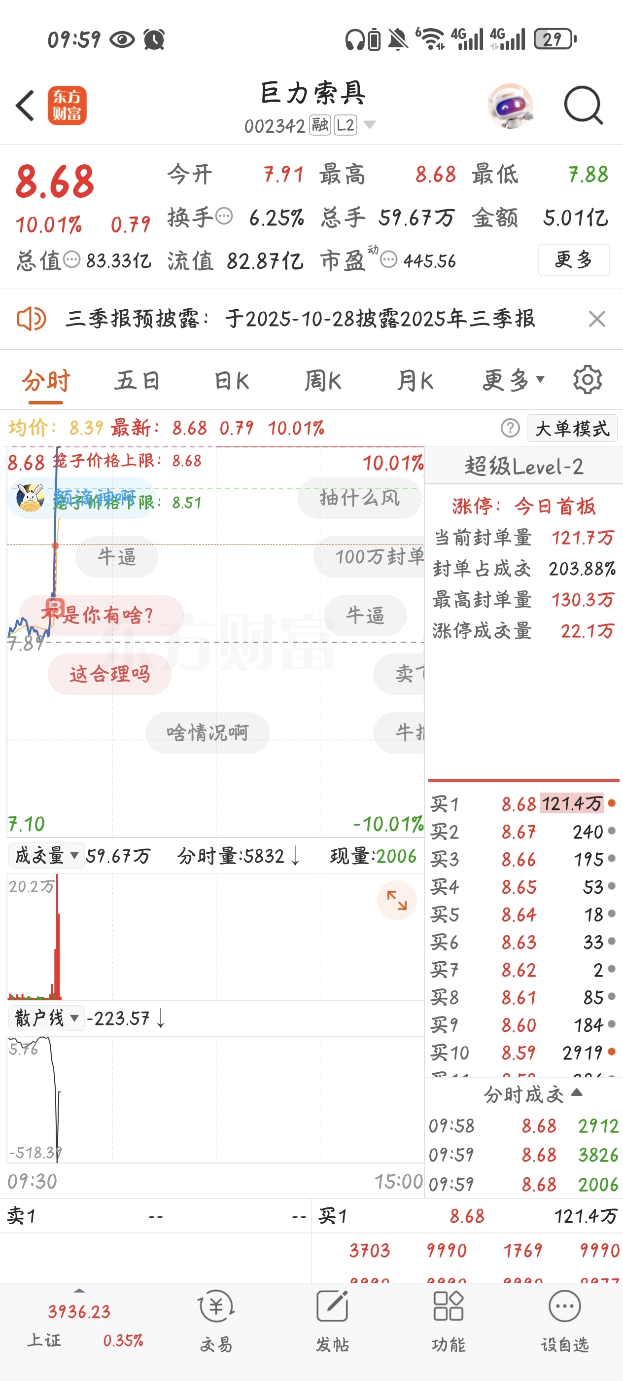 $巨力索具(SZ002342)$ 早盘就感觉你有希望入晚了