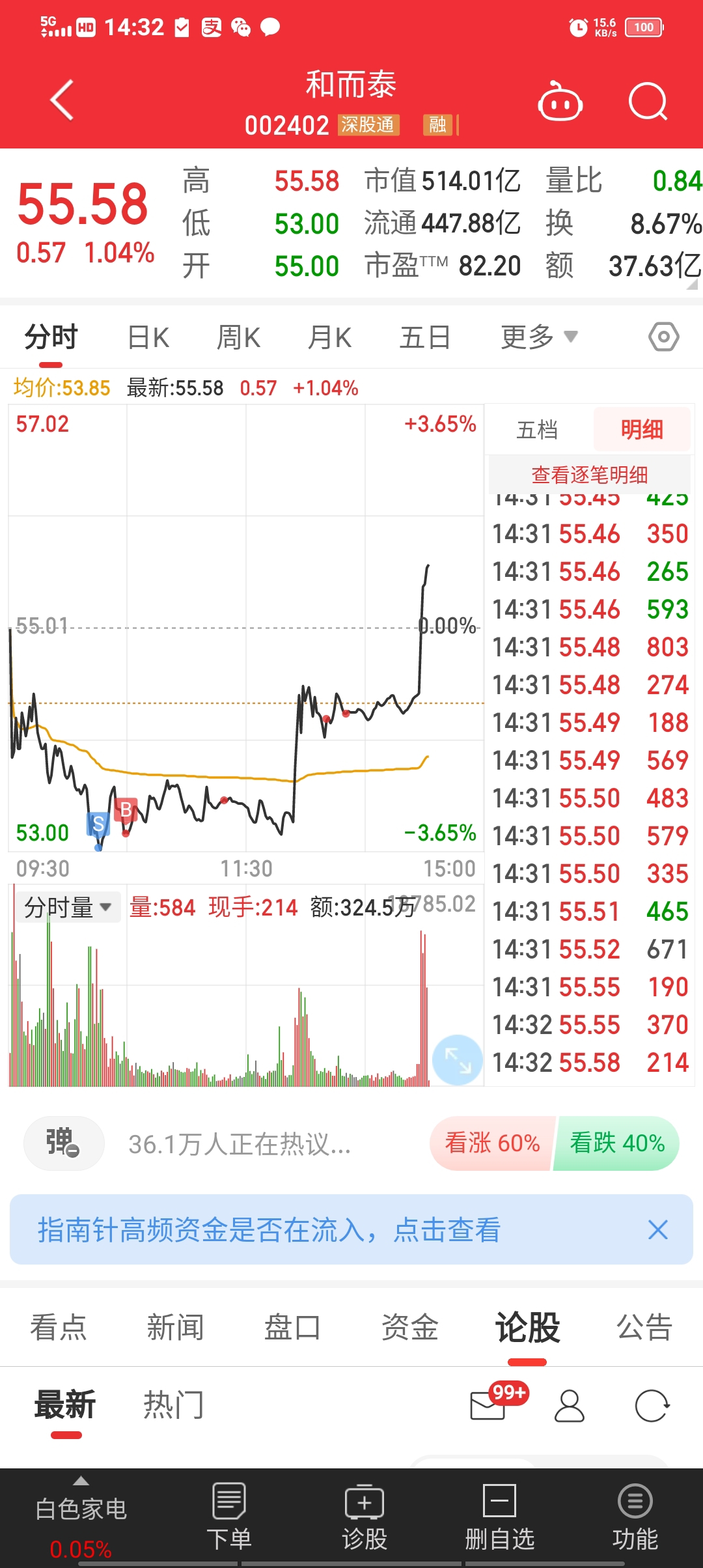 大号割了巨力换了指南针和而泰。大号账面今天红了,早盘亏5000。。。小号没动,小