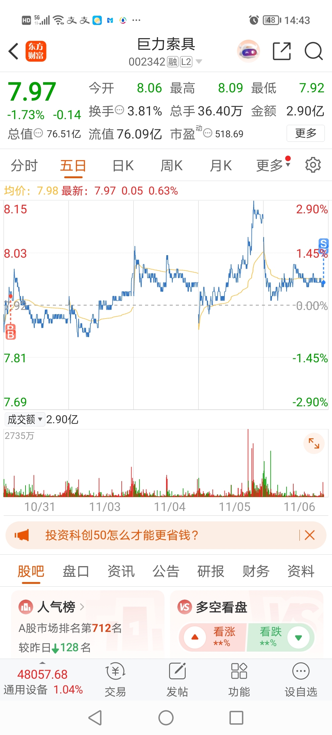 $巨力索具(SZ002342)$ 卖了,垃圾,拿了6天,赚了一百多