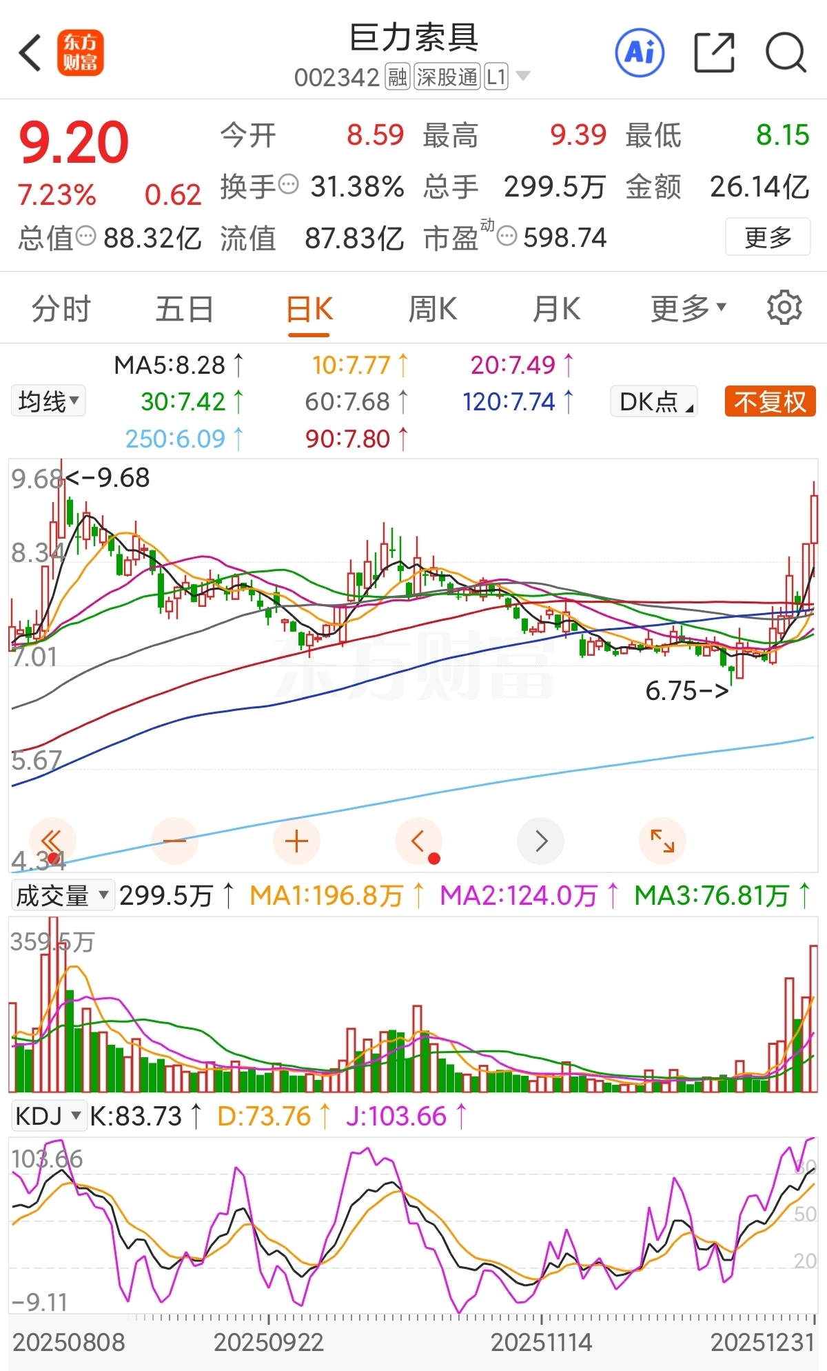 2025年12月最后几个交易日,巨力索具走势强劲,有大资关注,走势真不错,多头资金放量震荡拉涨,一改之前低迷走势,震荡向上放量大涨,可喜可贺!
