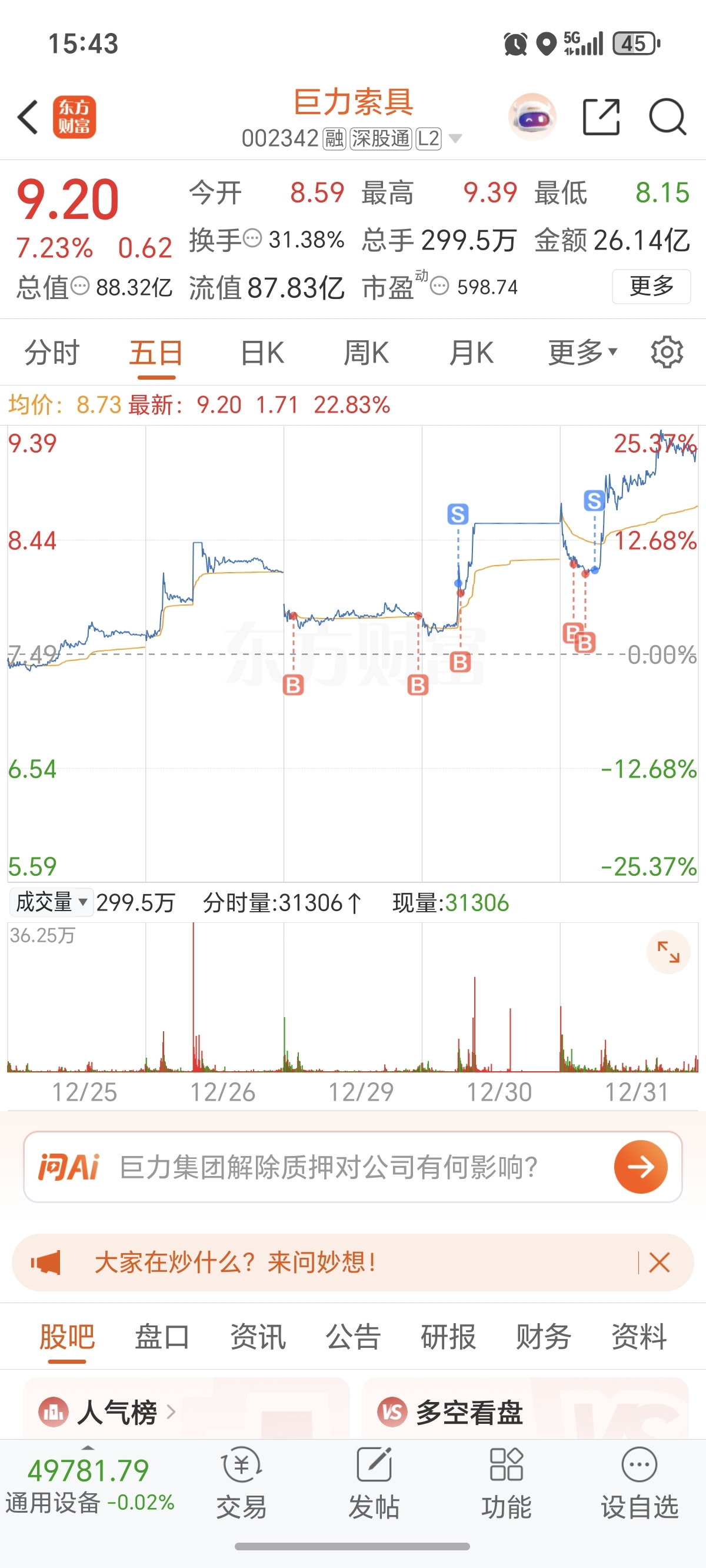 $巨力索具(SZ002342)$ 翻来覆去的睡不着,明明已经是低点了,怎么卖掉的,到现在都没想明白,看着几个万手大单一直砸盘,最后一个8.20的万手大单砸下来,我直接8.19走了,主力庄家太坏了