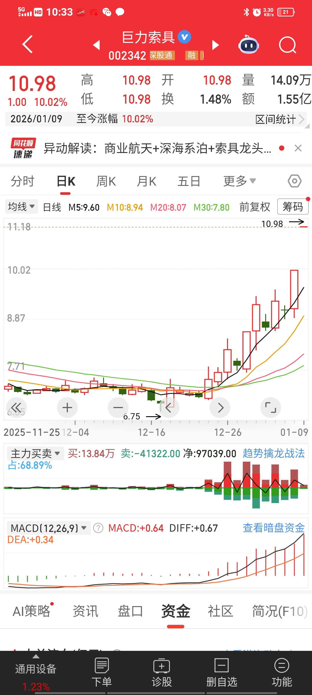 $巨力索具(SZ002342)$ 每次大涨一二天,都会大跌一天,大跌那天尾盘或次日开盘都是买点,昨天早盘有钱买,犹豫半天买别的了,拍大腿