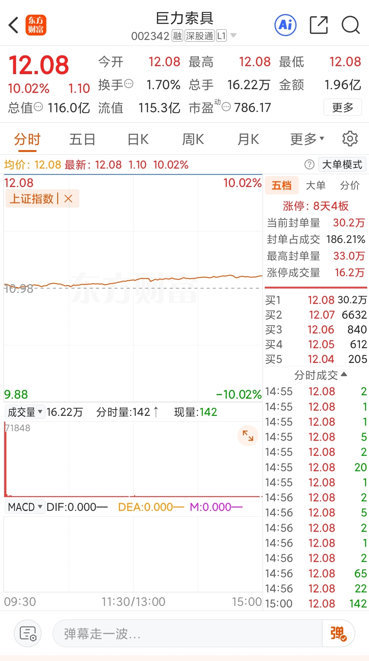 巨力索具涨停封单还大,现在商业航天风口上,巨力索具沾上点边,主力资金做多牛逼,势头正大火。等那天多头封涨停停意愿不大时,那就是进入行情尾声了,必须坚决把仓位清了,毫不犹豫,高位放量出货必清仓。