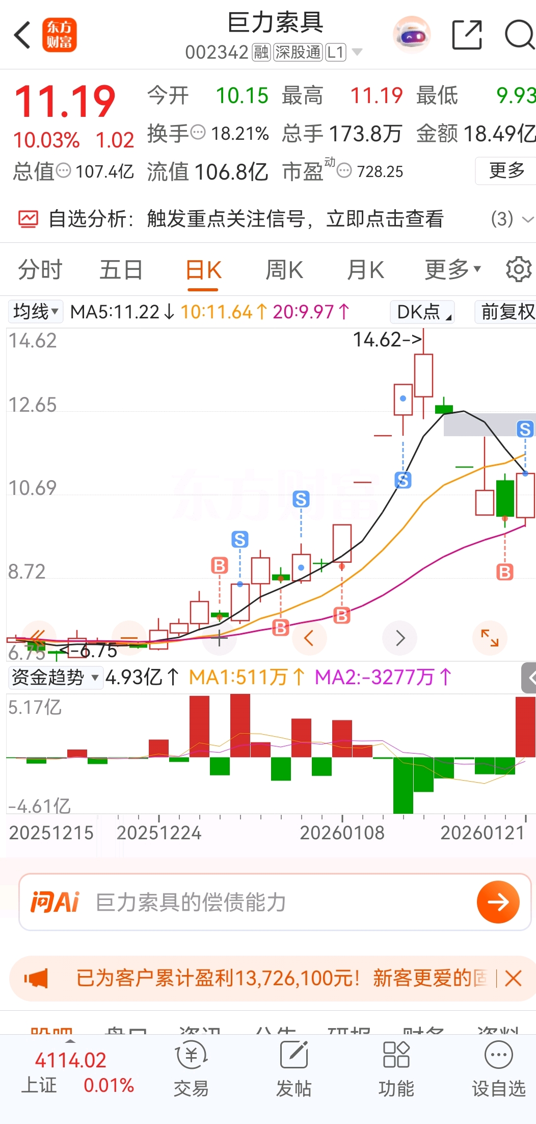 $巨力索具(SZ002342)$ 帮我算下赚多少点