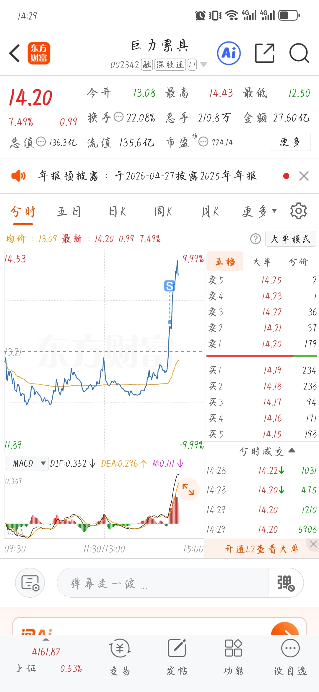 $巨力索具(SZ002342)$ 这里跑了,我自认为如果我守住,这个在6%我也会忍不住跑,我喜欢落袋为安。昨天入的12.82的本,今天走了赚了6个点,我也不去算最高了,但以6再跑的话,少搞了3个点