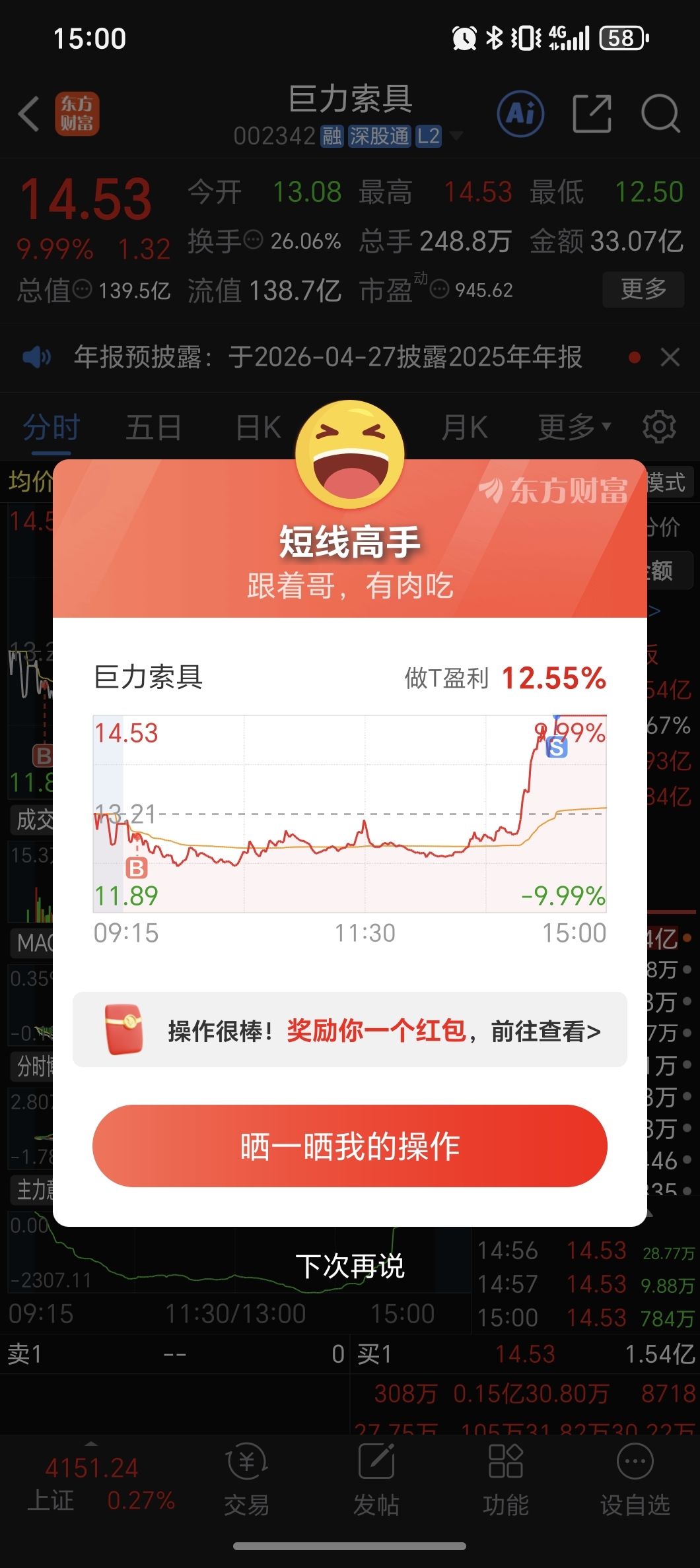坚定看好巨力索具,为防止明天产生分歧压力太大,今天选择做t,明天如果有机会,再低