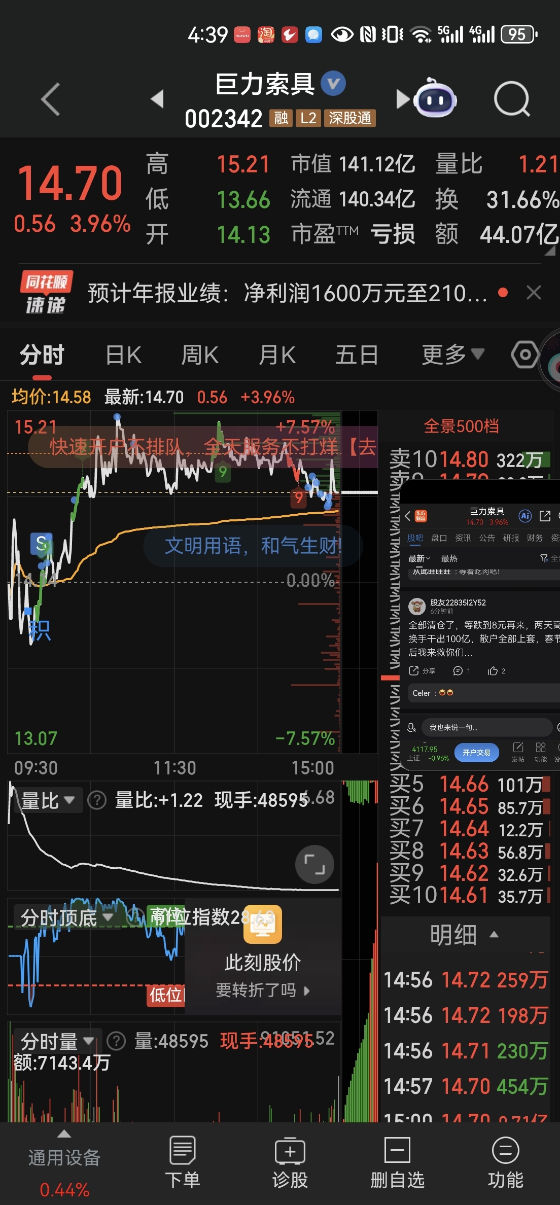 $巨力索具(SZ002342)$ 华东重机扭亏暴跌4天…巨力利好透支,己失上涨动能,下周一底开全部闷杀…今天全部清仓,至少三天后跌到9.87再来…下周一快跑不要回头…去仕佳光子爽几天先…
