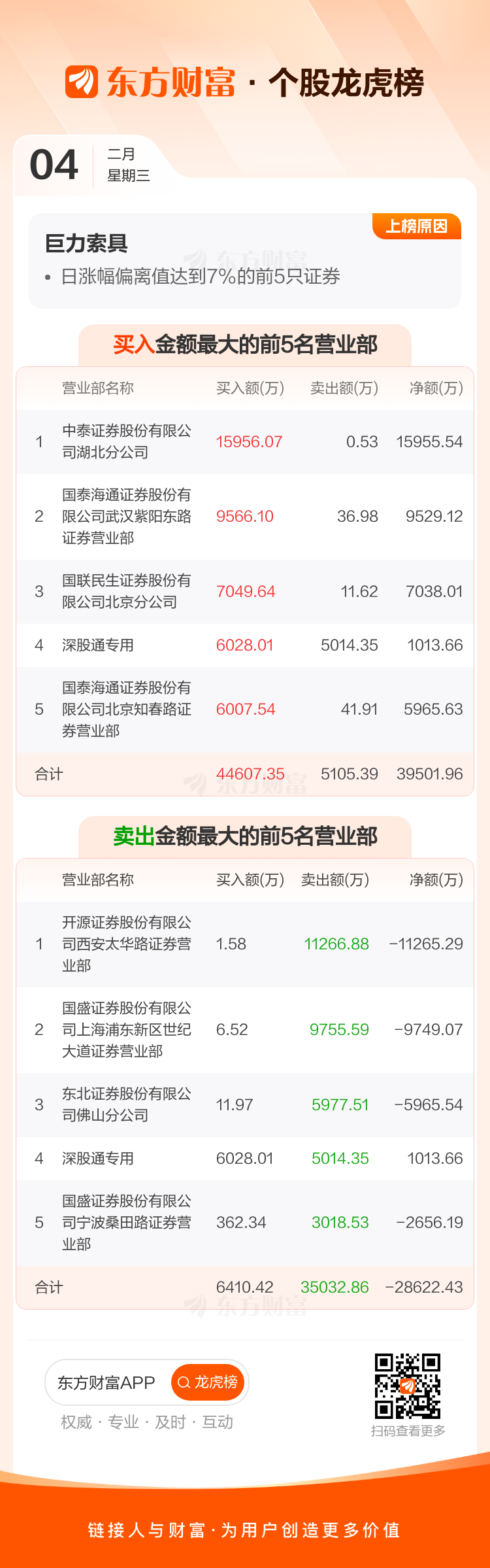 交易所2026年2月4日公布的交易公开信息显示,巨力索具因成为日涨幅偏离值达到7%的前5只证券上榜。巨力索具当日收报17.61元,涨跌幅9.99%,偏离值9.68%,换手率11.42%,成交额19.18亿。