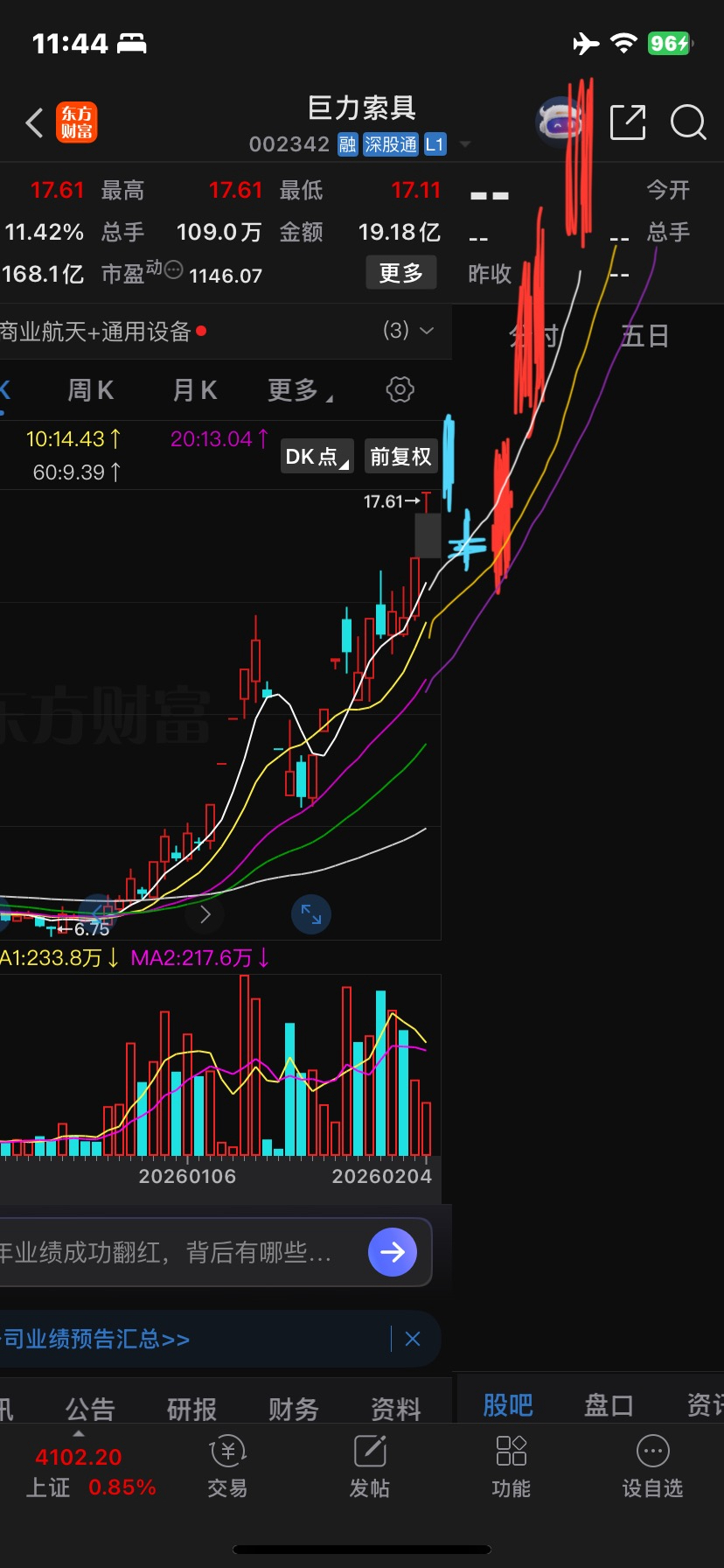 $巨力索具(SZ002342)$ 明天就破!为下周的白酒做大容量载体!不然白酒没一个容量票不行的,皇台太小也容纳不了啊。只能靠你,再涨就30亿的容量,够了,从航天过渡,下周的上涨就过渡到白酒概念加持!