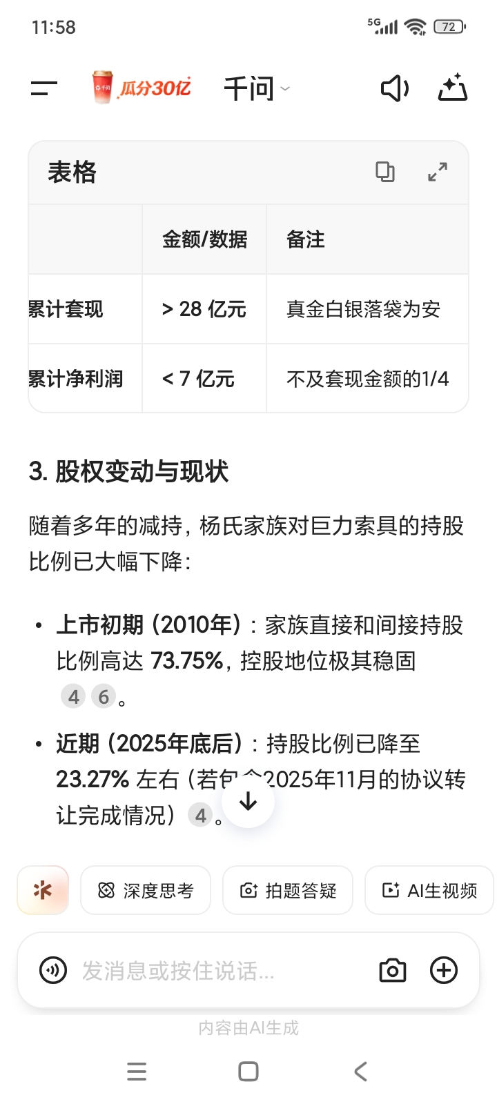 最近一次大额减持:在2025年11月,控股股东巨力集团通过协议转让4800万股,再次套现约 3.11亿元 。