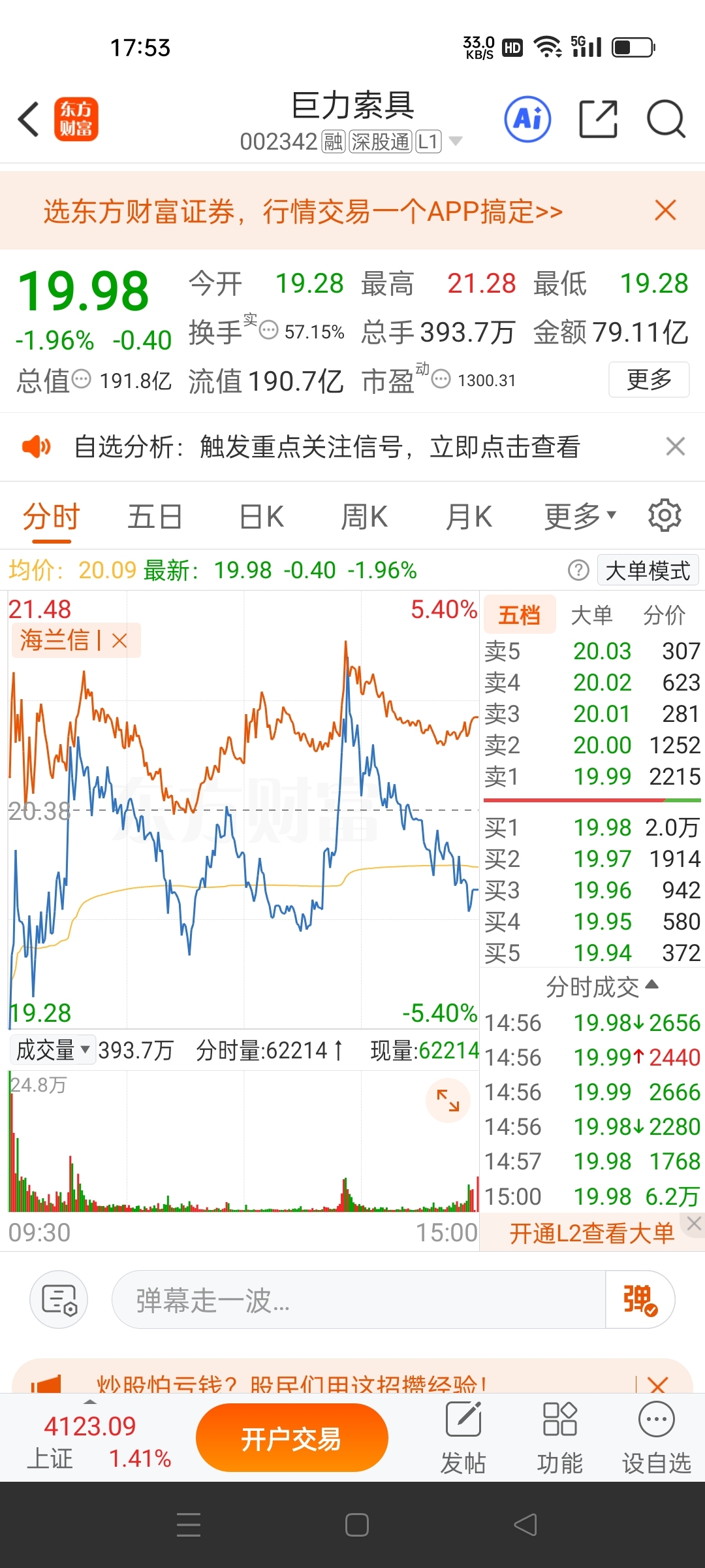 $巨力索具(SZ002342)$ 哎,还是差口气。明天走了。投降。短线估计不能赌海上了。那个基本成功要是有点啥的我得套死