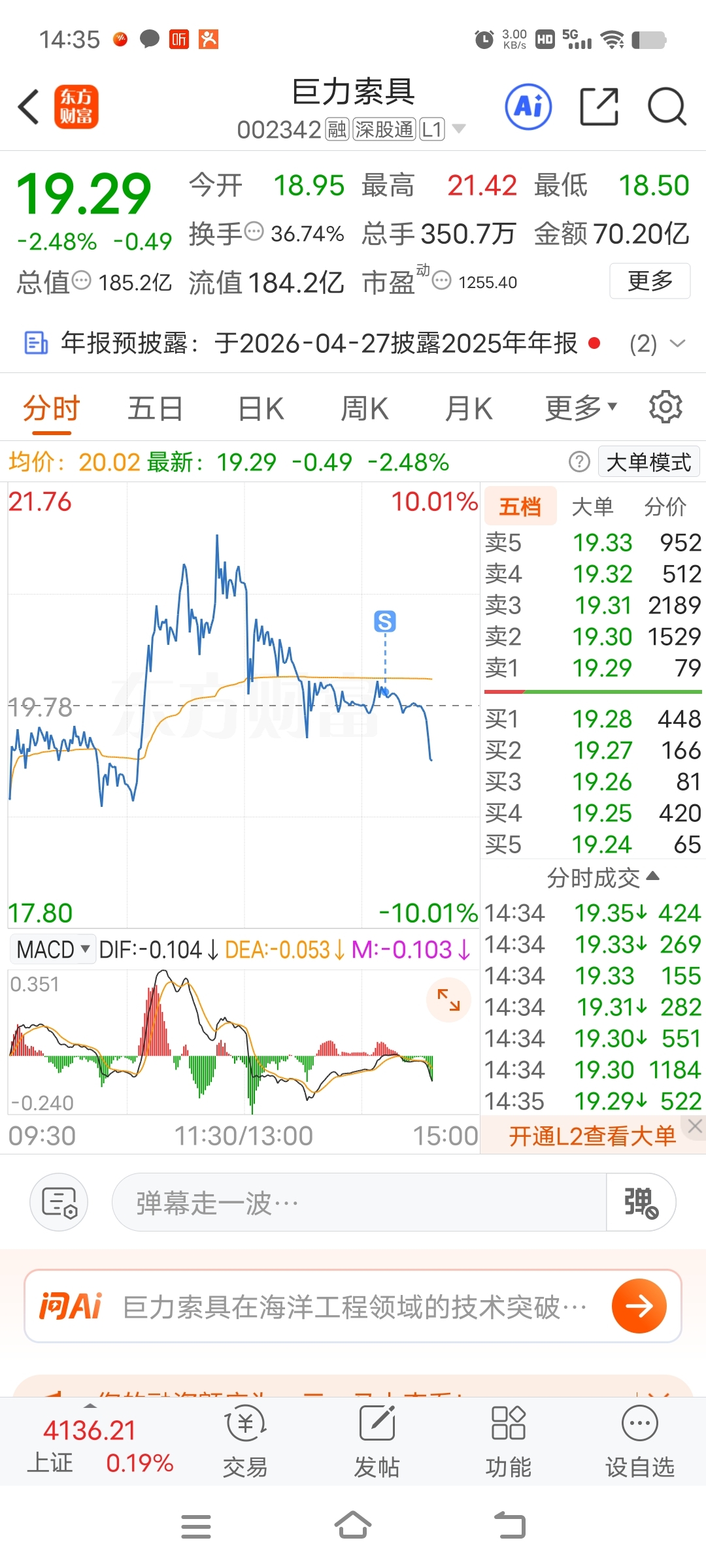 $巨力索具(SZ002342)$ 赚20个点没走现在省13个点走了