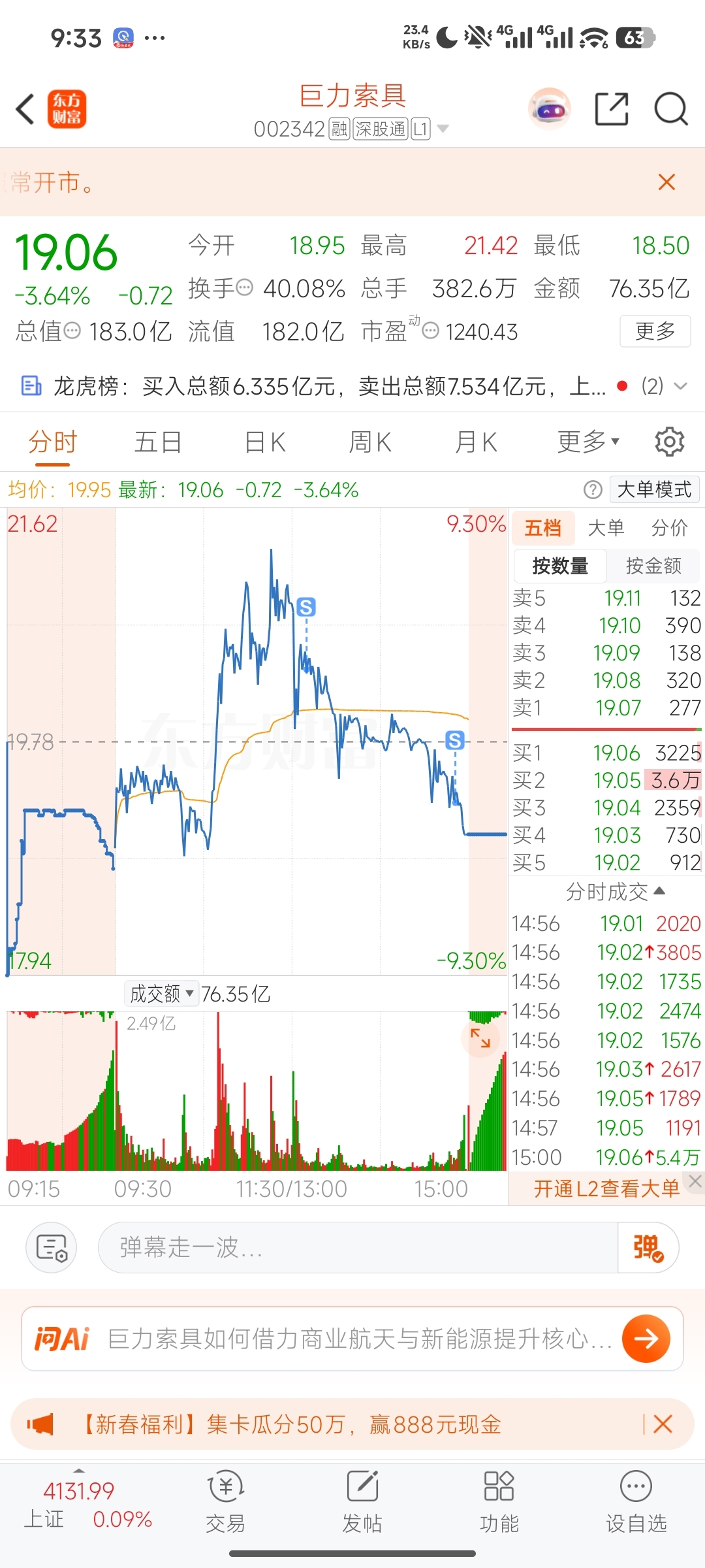 $巨力索具(SZ002342)$ 下午开盘在电梯里,正好信号不好,错过了卖点,拉起来没跑干净,尾盘看情况不对全卖了,躲过明天一劫