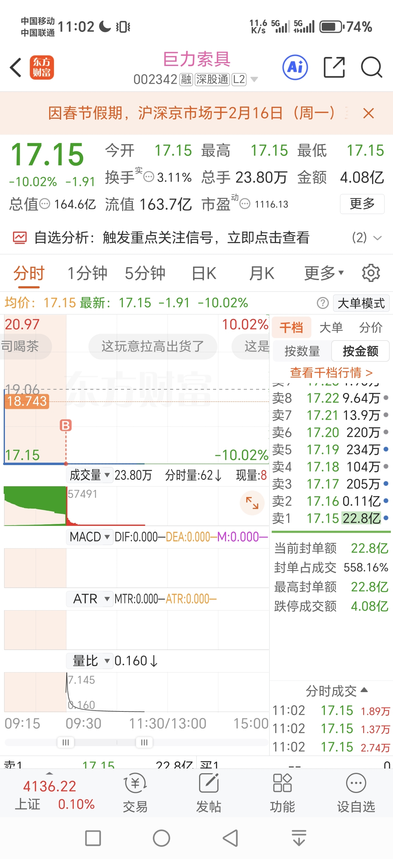 $巨力索具(SZ002342)$ 开盘买入五十万,兄弟们别害怕,有预期的