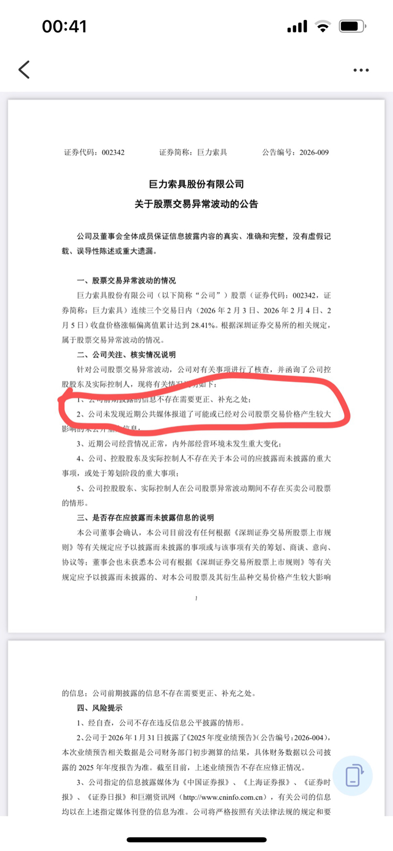 $巨力索具(SZ002342)$ 2月6号发公告才说没未发现公开媒体报道了可能对公司股价产生影响的消息,11号又跑出来澄清,可不可以定性为公司失职,需要追责可以咨询证监会