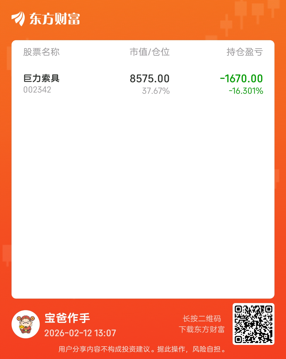 $巨力索具(SZ002342)$ 昨天就说了,今天一字地板,不过主力也没法儿自救了,三个板放人。大家安心过年吧,主力资金一时半会儿也出不来的。没有对手盘,就算有通道也走不完。三个板后再看有没有地板翘起来的机会