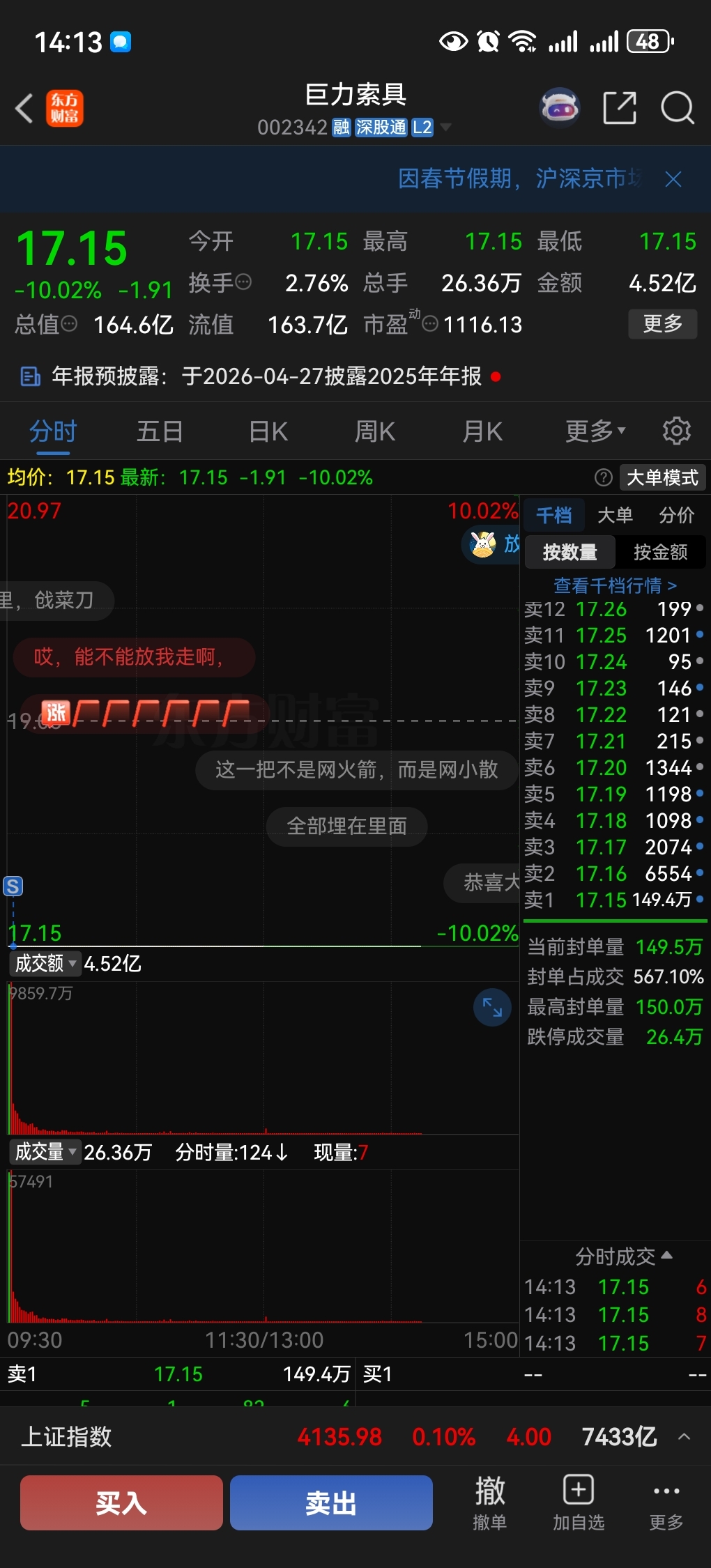 $巨力索具(SZ002342)$ 要信早信,昨晚就挂单子,出来安心过年了