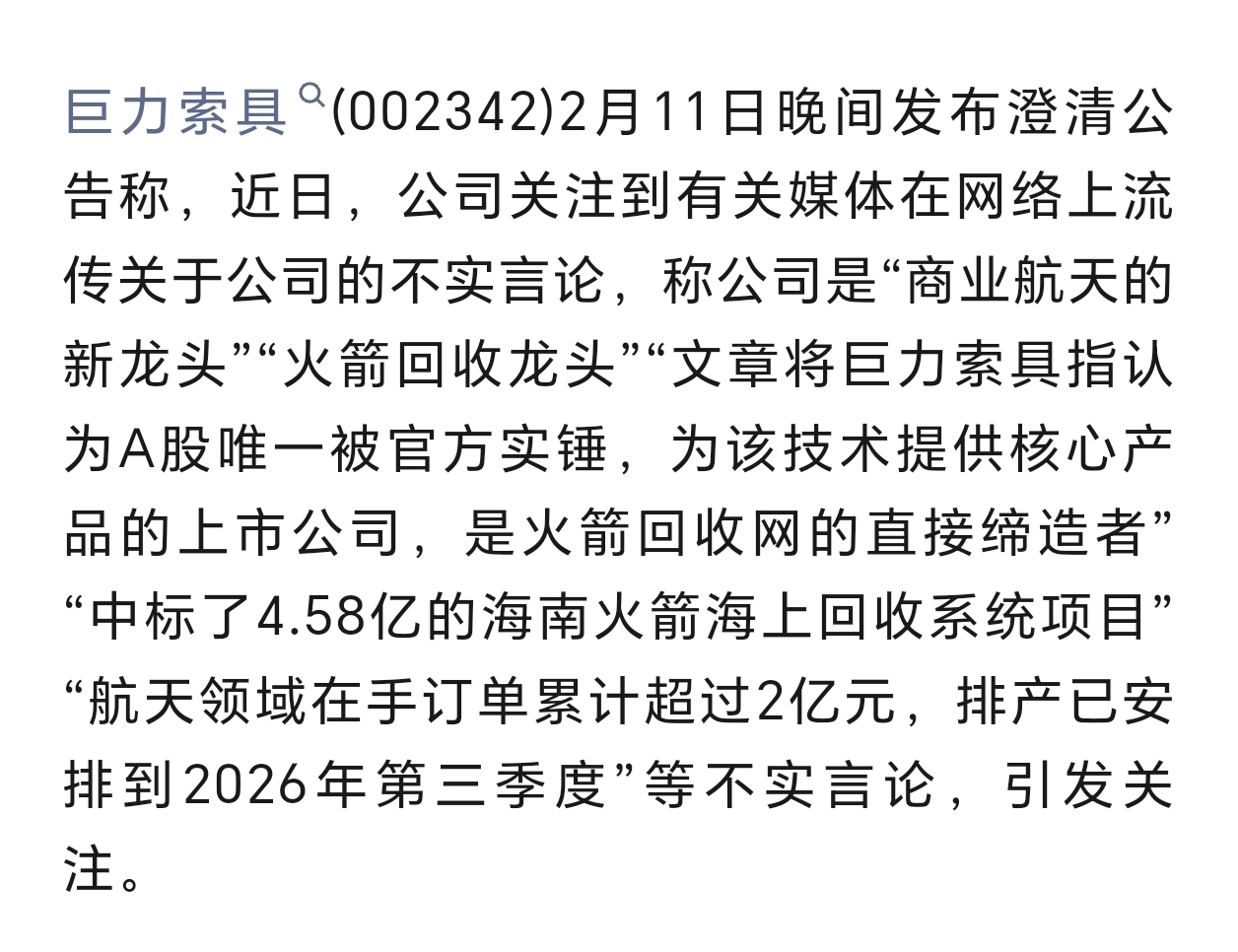 $巨力索具(SZ002342)$ 巨力索具:“中标4.58亿的海南火箭海上回收系统项目”等言论均为不实信息。为什么不严查公布中标信息的来源?