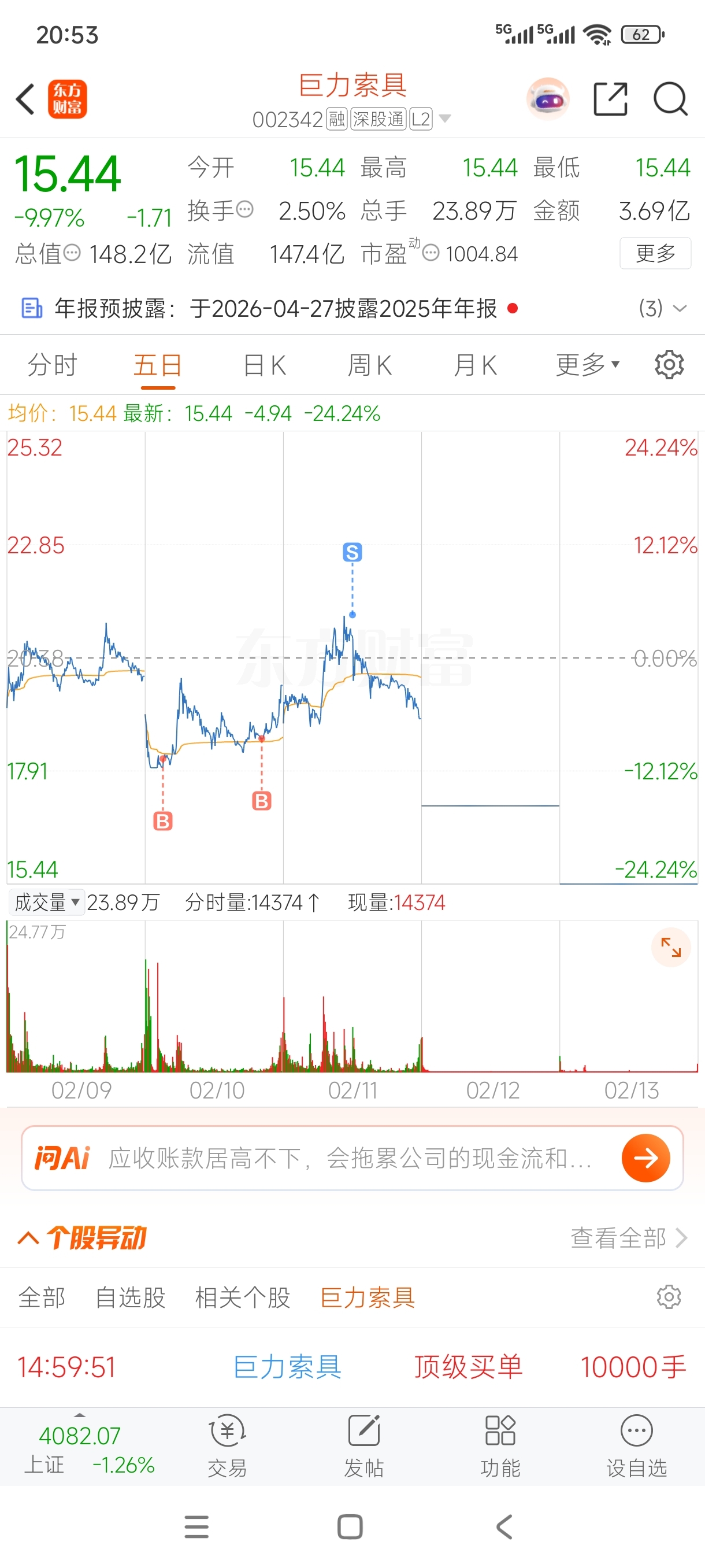 $巨力索具(SZ002342)$ 如今行情,别天天研究指标,完全靠主力心情,有利润就跑,别贪,18.22进的,21.32跑的。