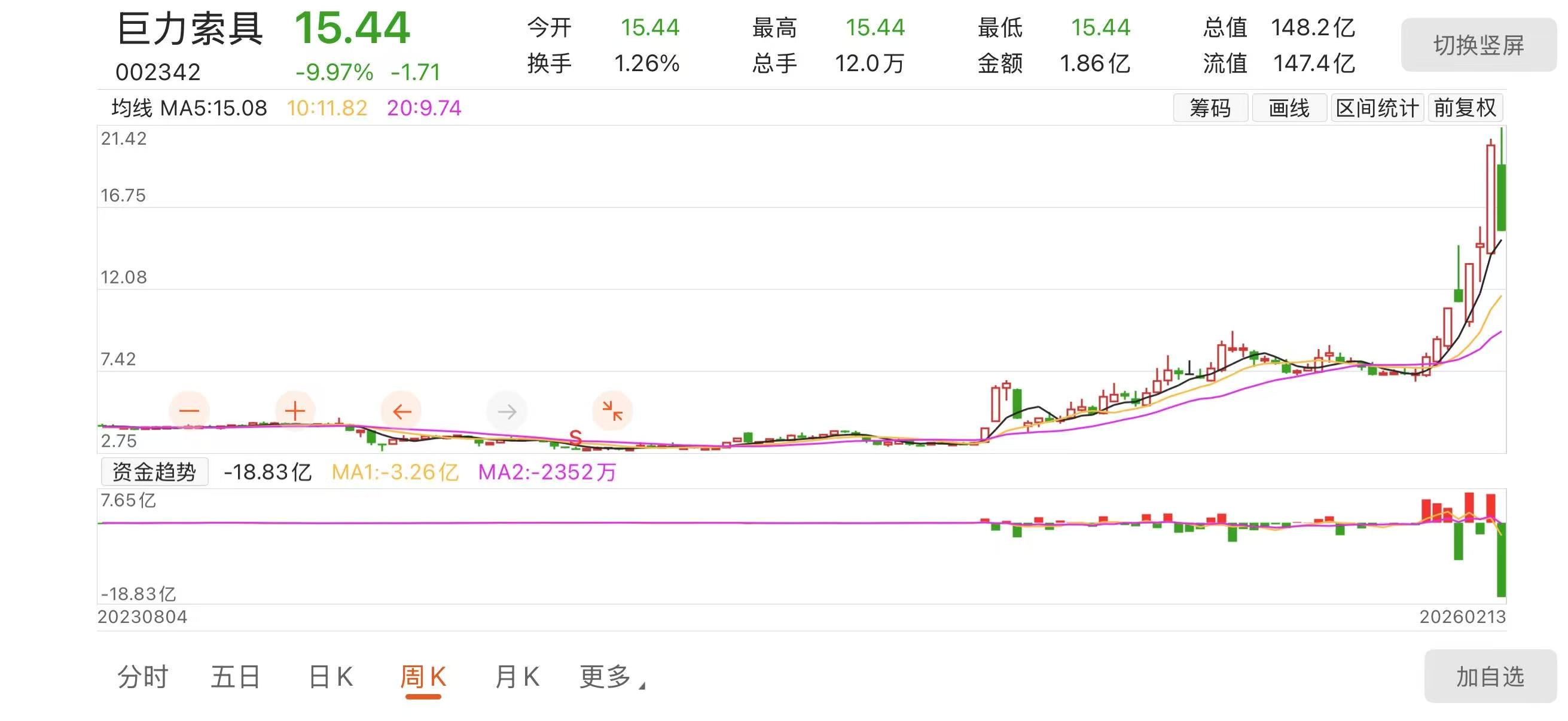 2月12日,巨力索具一字跌停,结束了此前多日上涨的凶猛势头。2月13日,巨力索具开盘再次跌停,收于15.44元/股,总市值约148亿元。