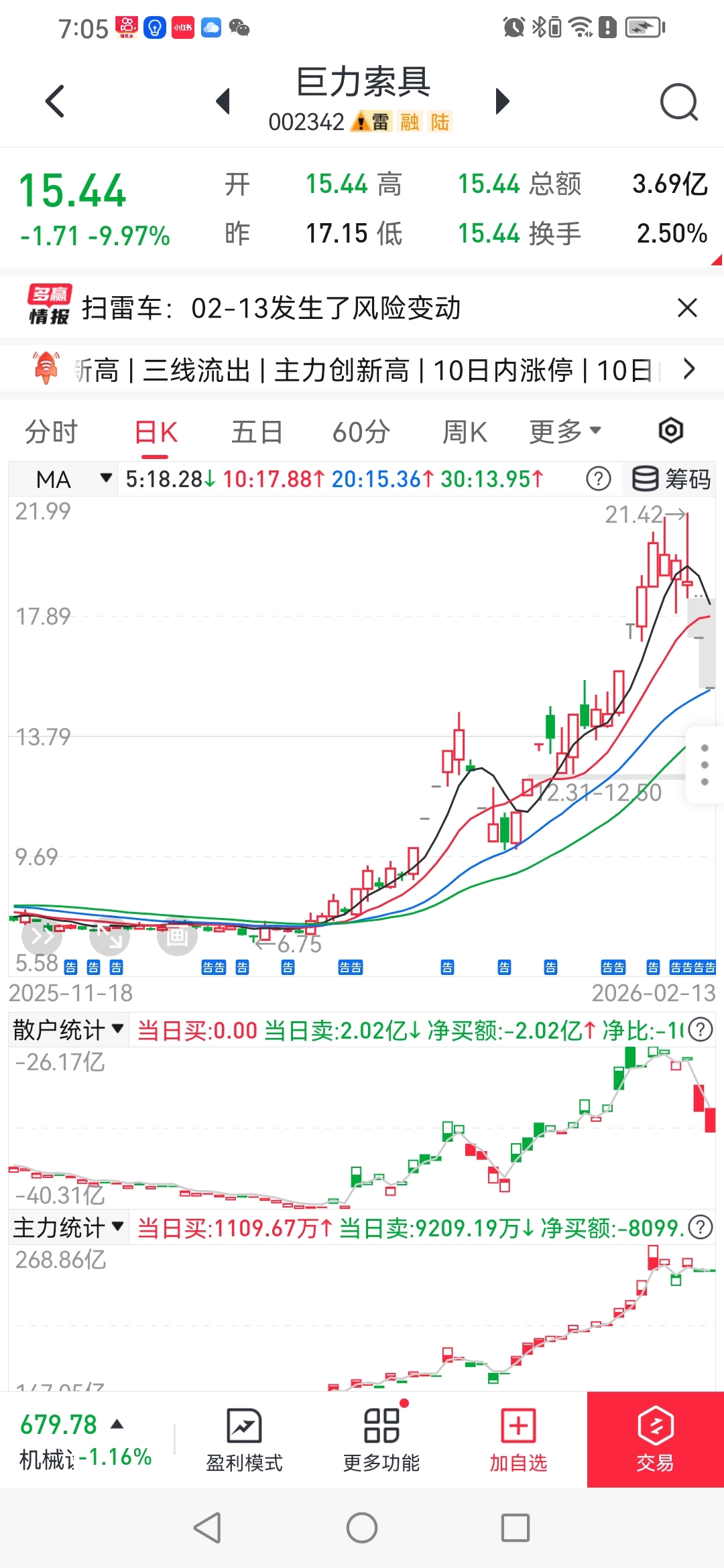 $巨力索具(SZ002342)$ 没有人控盘啊?大单,呵呵,经传多赢软件是给被对接散户看的,大单看软件,没有机构名称,没用的。控盘量化吃货同时出货,触发大单买大单卖程序,控盘量化单纯吃货,大单不能卖货。控盘单纯出货,触发卖货。有控盘量化吃货,终止大单卖货。瞎子大单拉升,要高举高打,才能成功。