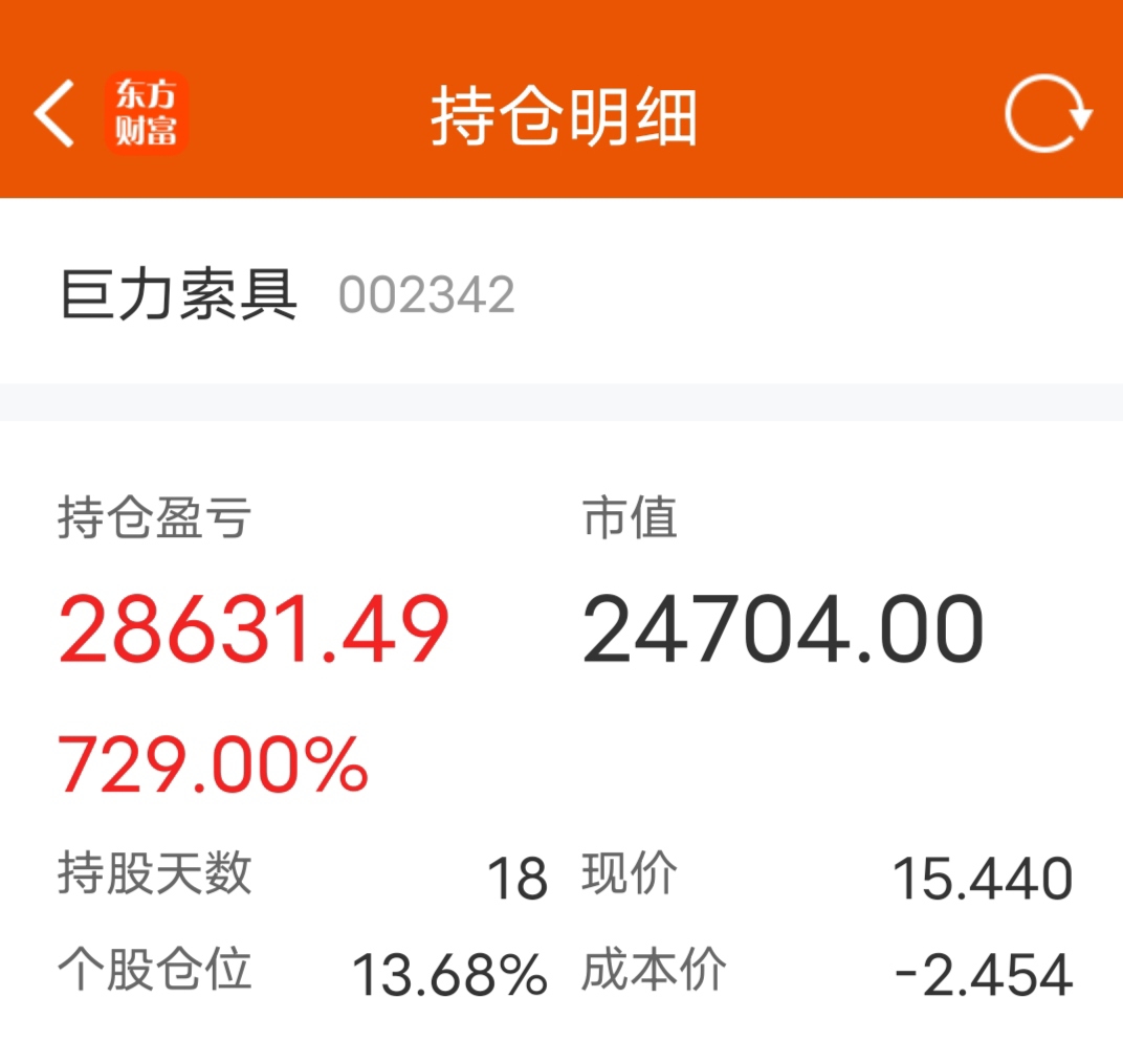 $巨力索具(SZ002342)$ 兄弟们!你们还好吗!我卖了还剩不到两层仓,-2.45的成本,慢慢耗谁怕谁,耗到退市也不亏钱。